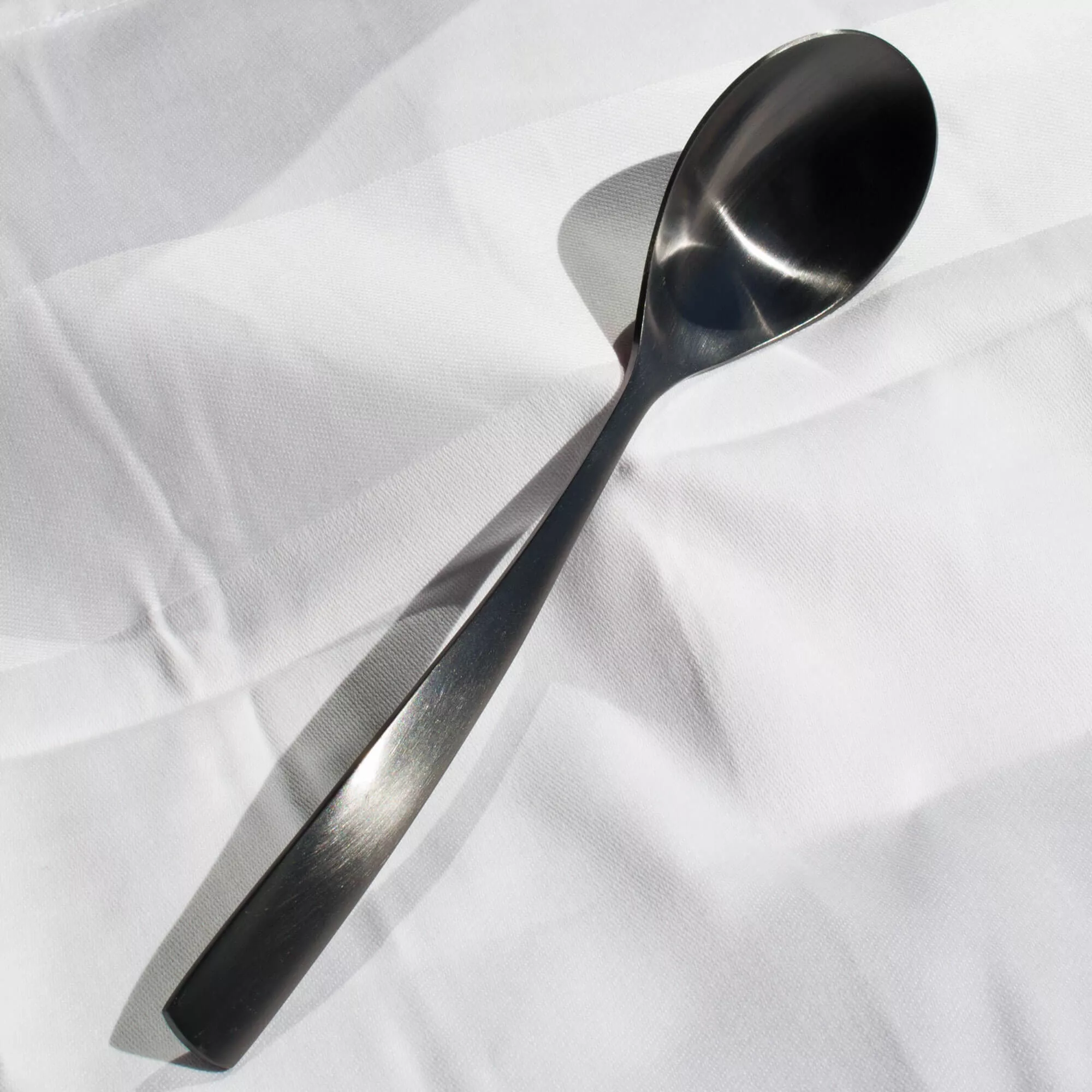 The dining cutlery from the 'BCN Colors' series by Comas is an optical highlight in itself. The black table spoon from this collection is no exception. It shimmers in a silky-matt anthracite-black which combined with its curved shape makes it look very dynamic. The bowl of the spoon is approx. 6,5cm long and 4,0cm wide. This makes the spoon useful for dinners, soups and more. It is PVD-coated and made of nickel free stainless steel. You can also clean the table spoon in the dishwasher. The black spoons are available in packs of 12.