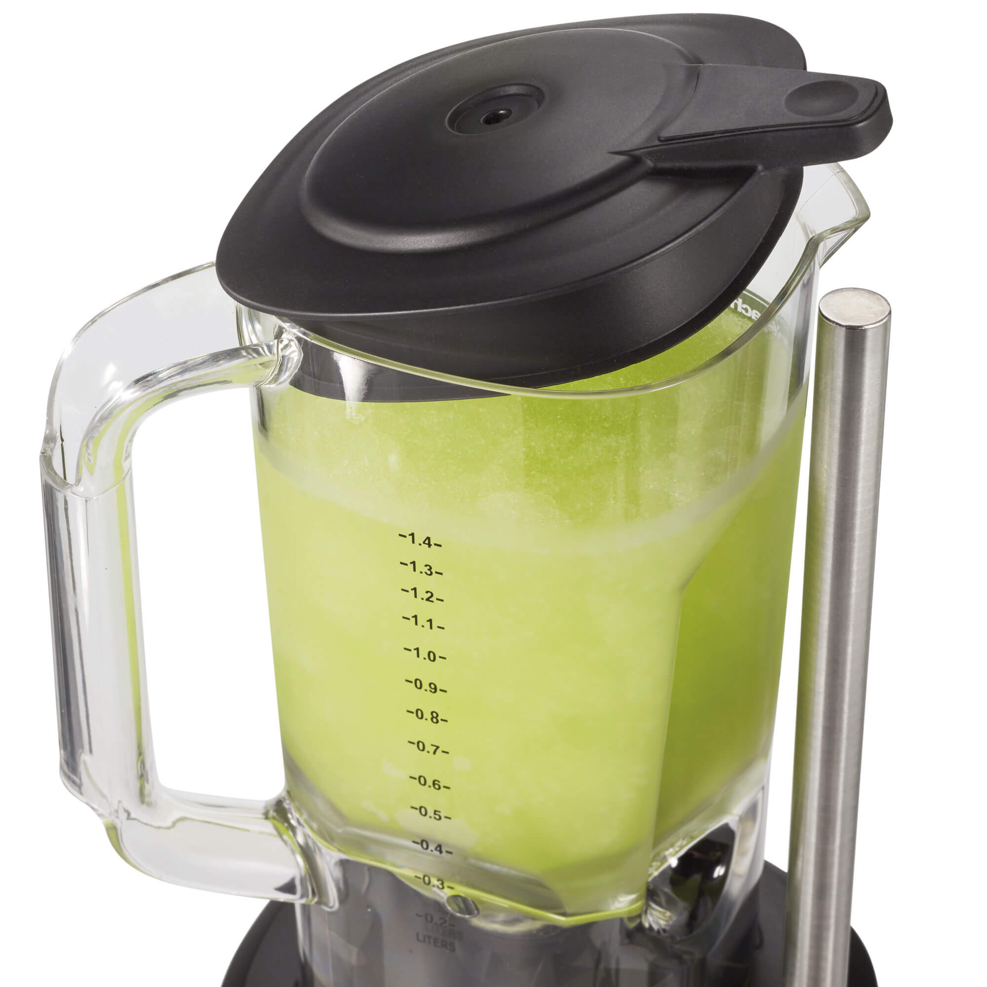 The container is made of transparent polycarbonate and therefore convinces with particular break resistance and hardness. Just like a conventional measuring cup, it is equipped with a handle and a measuring bar in 0,1l intervals. The latter ranges from 0,2l to 1,3l. The container can be closed with a black lid, which reaches a few centimeters into the cup to close it securely. The lid has a 'lid open' safety sensor, which prevents the device from blending as long as the lid itself is open.