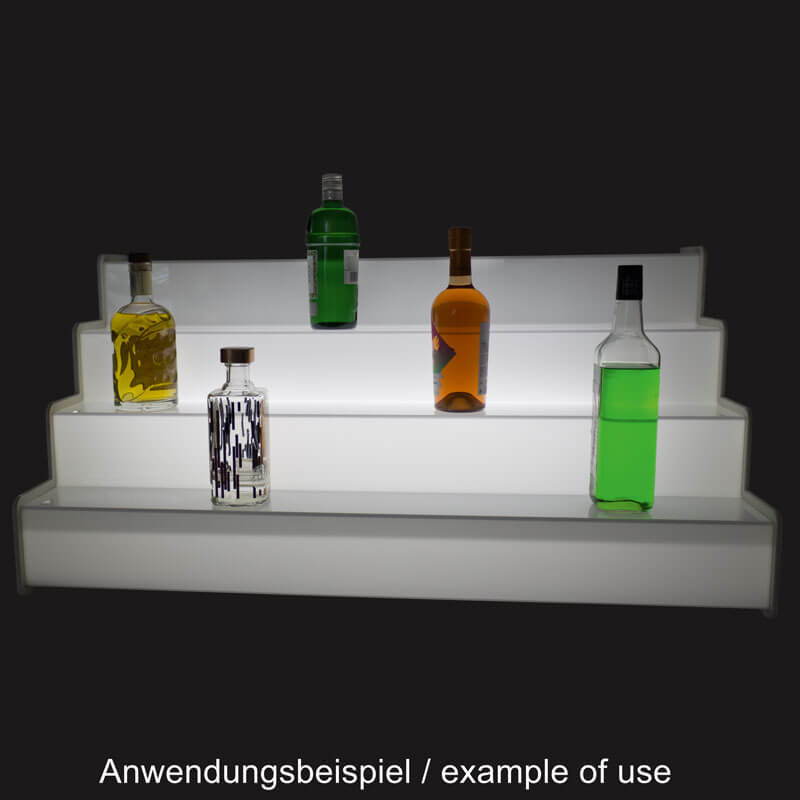 With a width of 100cm and four steps, the back bar liquor display offers plenty of space to present your spirits within easy reach. Each of the four steps is approx. 11cm high and 11cm deep. The total height of the bottle staircase is 44cm. When the integrated LED light is switched off, the polycarbonate liquor staircase presents itself in plain white.