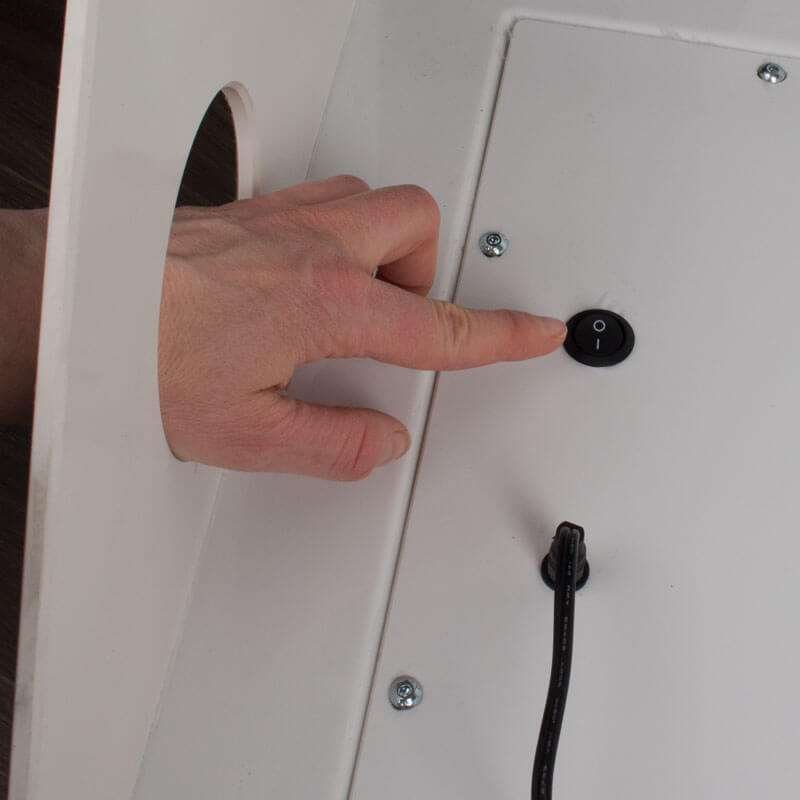 You will need an outlet nearby to power the staircase. The cable is approx. 190cm long. The remote control works with a button cell battery. While you can switch the light to stand-by using the remote control, the on/off switch is located underneath the steps. To press the switch, insert your hand through the hole in the side panel (10,3cm diameter). The bottle staircase can be tilted when empty. This allows you to position the hole either on the left or right side – particularly practical if you want to integrate the liquor staircase into an already constructed bar setup!