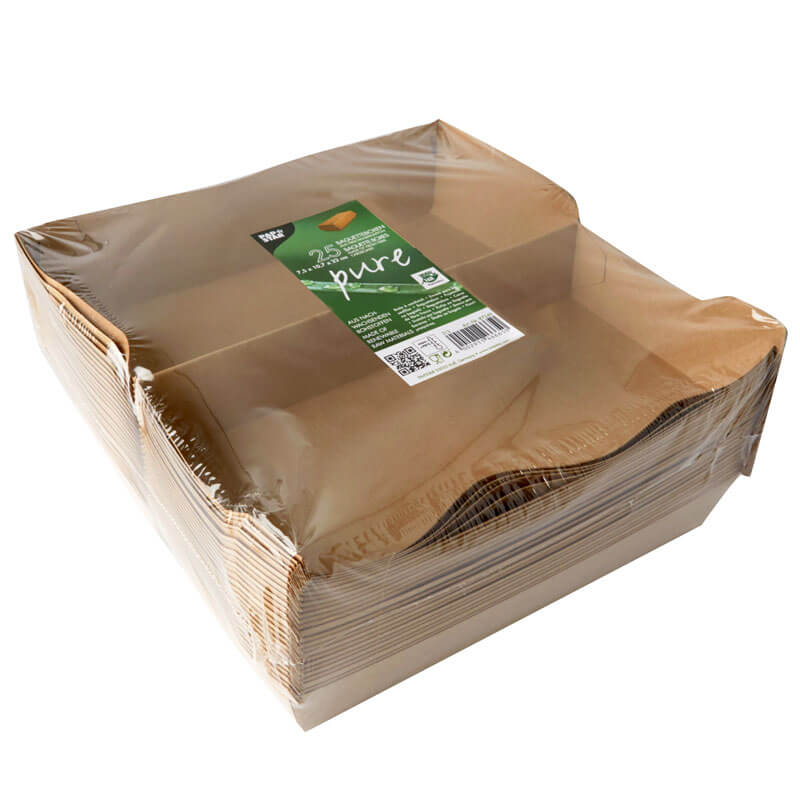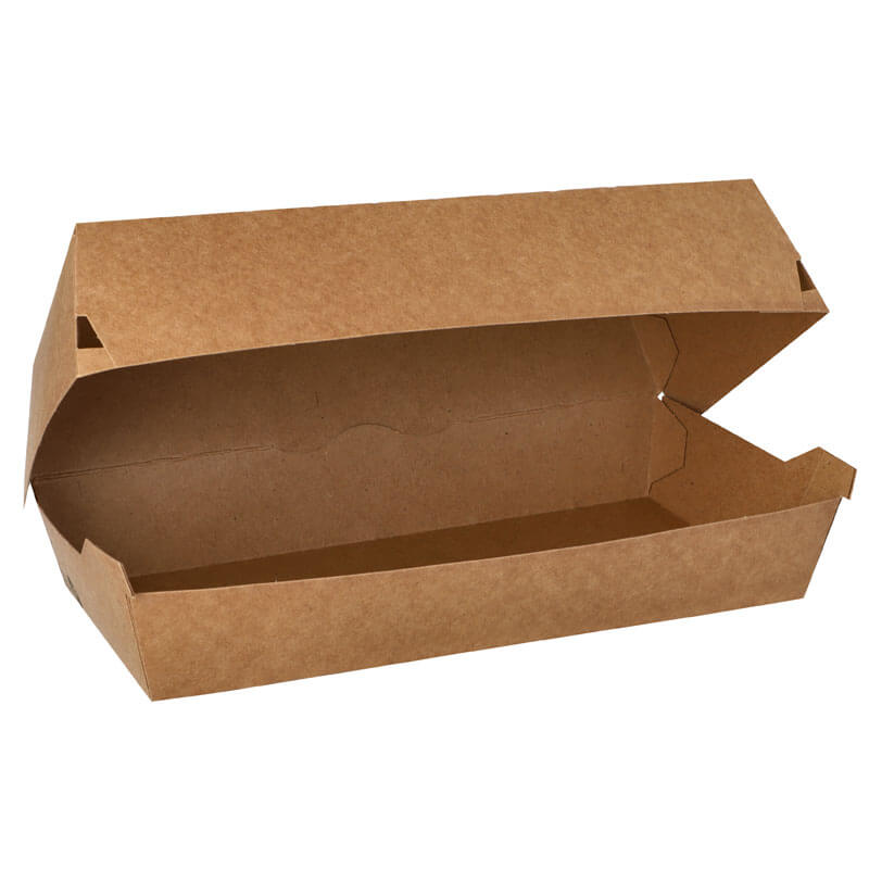 These brown cardboard baguette boxes are designed for delicious baguettes and other snacks that require an elongated box. Thanks to the organic coating, the to-go packaging is also suitable for fatty foods. The baguette box is closed with a practical hinged lid.