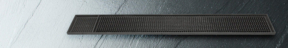 The bar mat is a pad on the bar counter on which cocktails are prepared and served. It is used to protect the work area and to collect spilled liquids. Bar mats can be found in different shapes, colors and materials. The shape of the bar mat is determined by its area of application. A distinction is made between work area and service area bar mats. Bar mats are made of rubber, fabric (neoprene) or metal. The rubber mats are available in different colors, sizes and thicknesses as well as with different knob sizes. In addition, rubber bar mats usually have an edge to keep spilled liquids inside the bar mat. Generally, rubber bar mats are not dishwasher-safe, as they tend to deform at high temperatures.