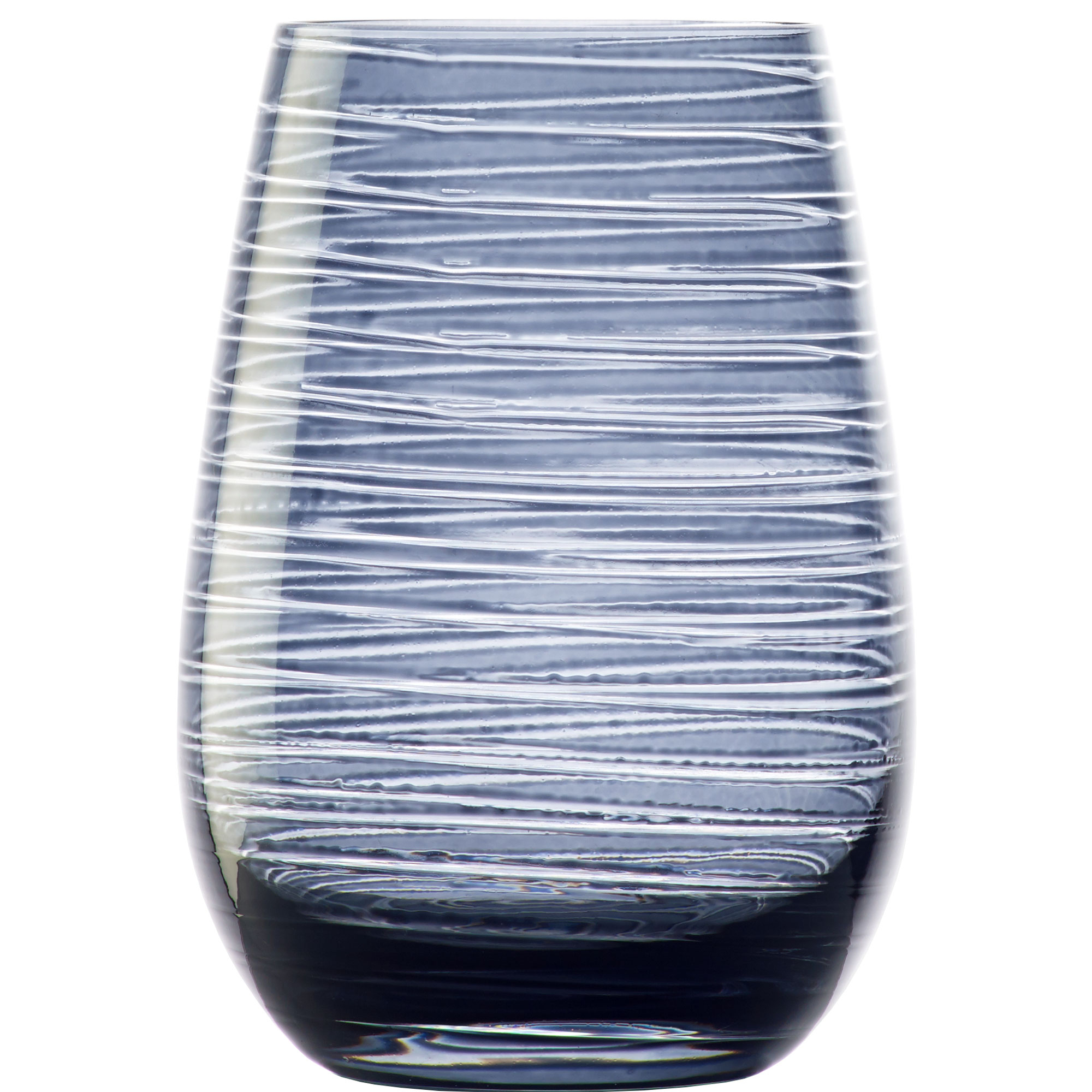 The typical surface structure of the series covers the entire outer surface of the roundish glass. Its pressed-in pattern is composed of a plurality of horizontal grooves, which in their intentional irregularity are reminiscent of swirling air currents. In addition to its visual appeal, the structural design also provides a tactile experience of grip. The side walls and base of the glass bear a grayish blue glass tint, consisting of organic baked-on paint. This cooling hue finally crowns the windy design!