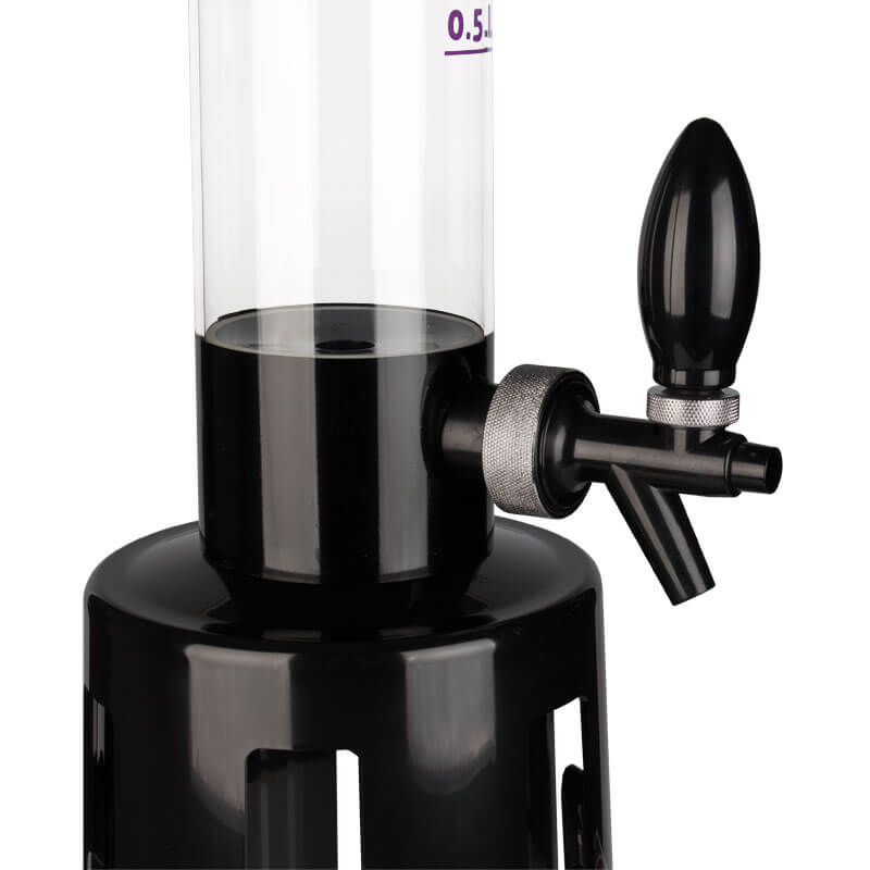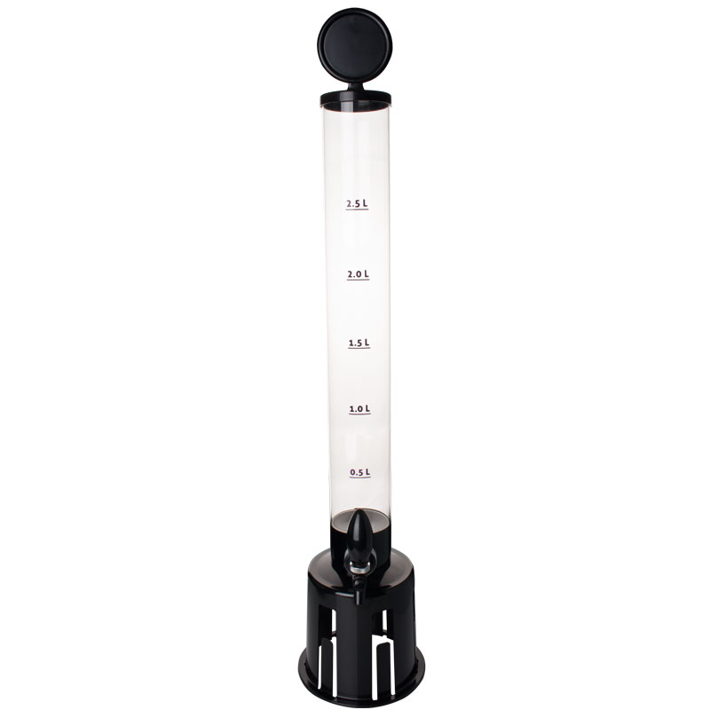 All components of the tower are made of plastic: the black parts are made of ABS and the tube is made of PMMA. PMMA is also known as acrylic glass and is a very transparent and stable plastic that is BPA-free and food-safe. The wall thickness of the tube is around 3mm. The practical scale has filling lines at 0,5l intervals and goes up to 2,5l. However, when filled to the brim, the beer tower can hold 3,25l.
