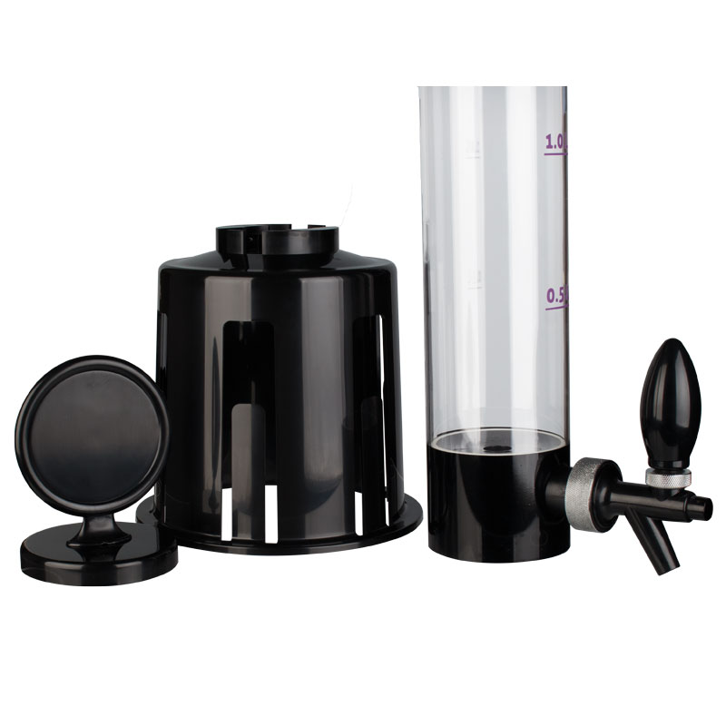The beer tower is 96cm high in total. The height is made up of the black base, the transparent tube with scale and a black lid with medallion. All parts can be easily taken apart and cleaned. The tube is filled from the top. The plastic tap is located at the bottom.