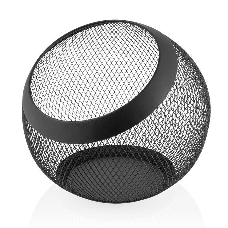 Use this round, black metal basket on a buffet table or counter. It measures 24 cm in both height and diameter, giving it a spherical shape. Thanks to a flattened base, the fruit basket remains stable. Its wide opening makes it easy to fill and remove fruit, rolls, and more.
