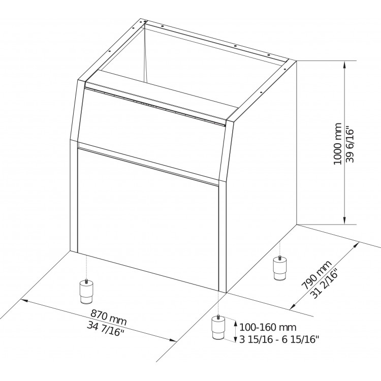 Setup & handlingWith a footprint of 870 × 815 mm, the storage container remains surprisingly compact despite its large capacity. The adjustable feet (100–160 mm) make it easy to set up and align. With its stainless steel housing (18/8, Scotch-Brite finish), it is optimized for long-term use in the catering industry.