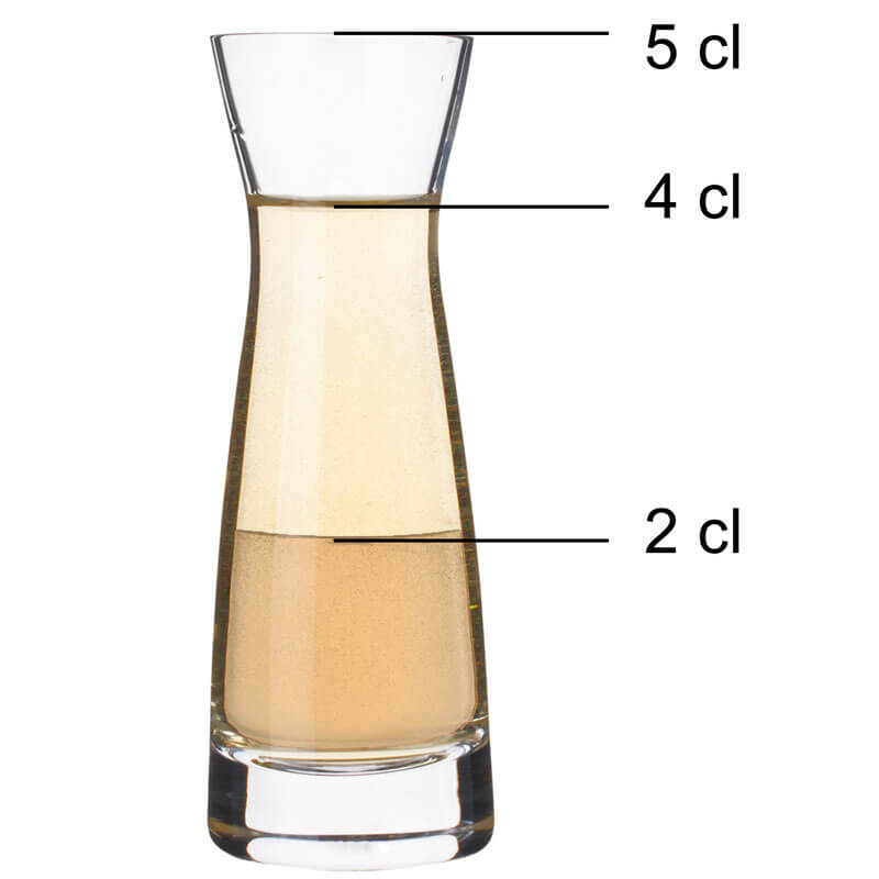 The carafe XS from Stölzle's 'Universal' series holds around 50ml when filled to the top, but is designed for a quantity of 40ml. The small carafe is 10,5cm high and has a maximum diameter of 3,8cm. This means that it is not a wine carafe, but the mini carafe is meant for spirits and cocktail ingredients.
