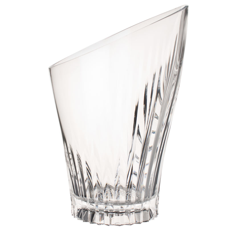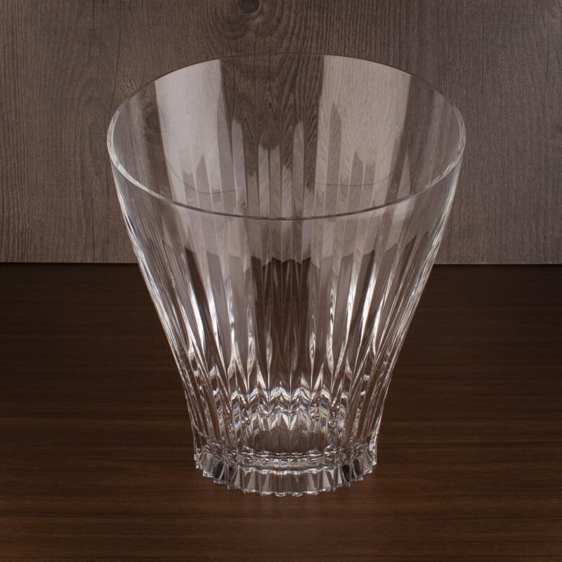 The Glory champagne cooler is characterized by its high transparency, brilliance, and durability. These properties and its textured pattern are reminiscent of crystal glass buckets. However, the acrylic glass used is lighter and shatterproof. The rim is oval-shaped and measures 27,7 x 23,5 cm, with a height of between 19,7 cm and 27,7 cm. The sophisticated line pattern, which refracts the light in an attractive way, is deeply engraved in the lower section and becomes increasingly thinner towards the top. The rim of the Glory champagne cooler has a smooth surface.