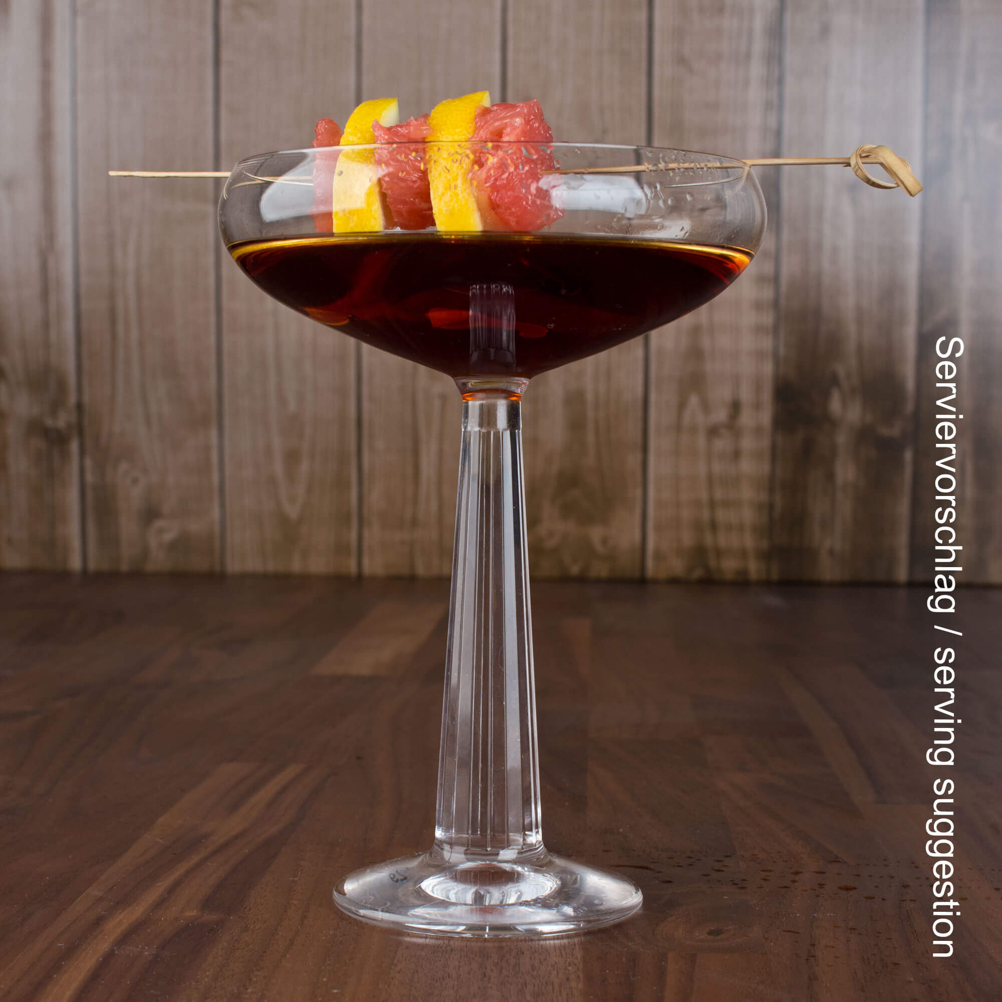 Attractive and unique coupe glasses by Turkish manufacturer Nude. The 'Big Top' series was created in cooperation with designer Youmeus and brings harmonic contraries of vintage and modern styles to the table. The stem on which the chalice sits is decorated with long parallel grooves. It resembles columns from ancient temples. The perfect glass, if your drinks are made for the Gods.