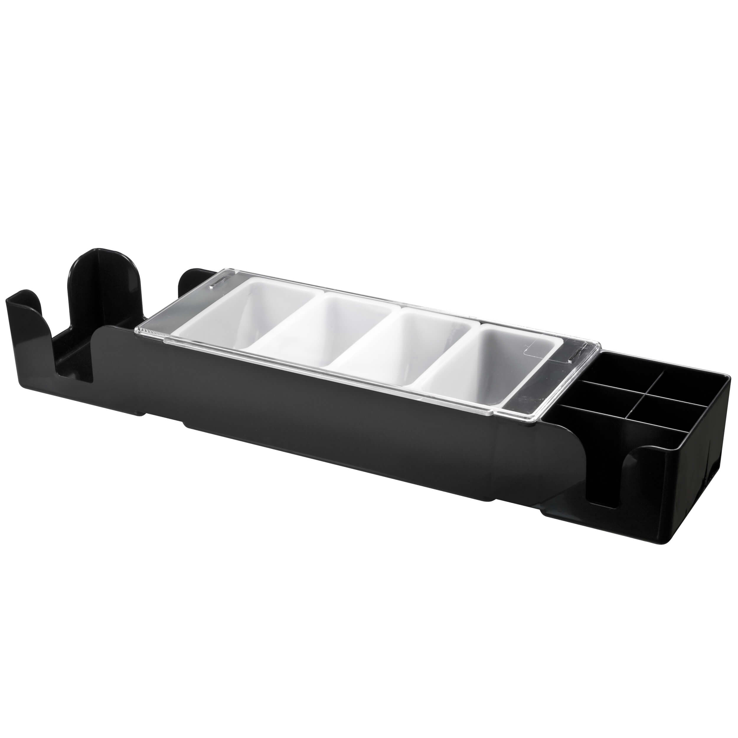 Organise reserved but ready to hand drinking straws, cocktail napkins, cocktailsupply and fresh lemons and garnish likewise. The four removable small and white coloured containers have a capacity of 0,47l. Furthermore they arecovered by a transparent lid. On the right side you have four equally sizedcontainers and one large container. On the left side the cocktail napkinscan be kept. The whole bar center is easy to clean and veryclearly arranged. This is a stable and sturdy version. This is a profitableinvestment.
