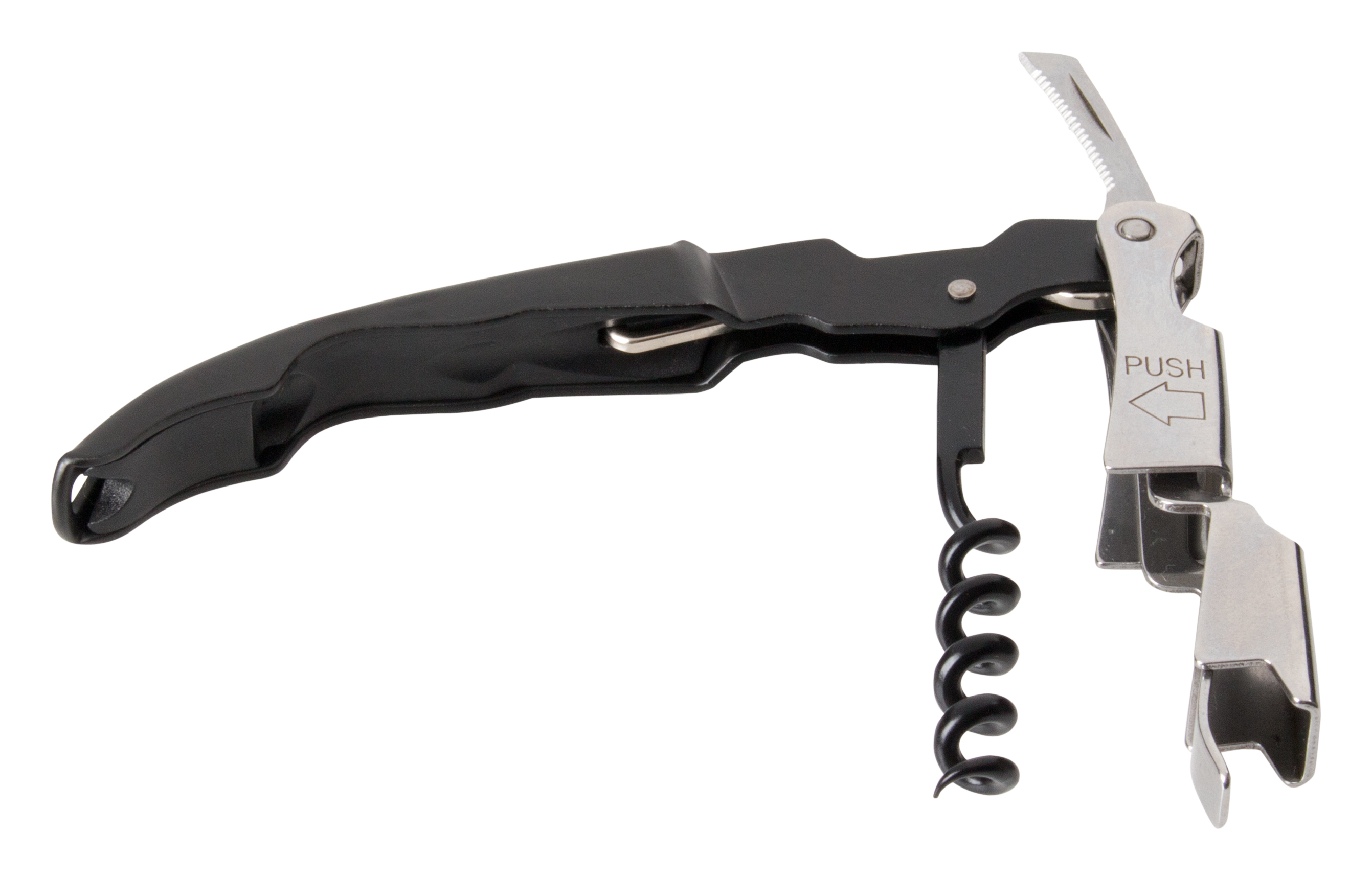 Coutale designed a corkscrew which is suitable for daily in the catering and private sector. It has an excellent weight and the handle is equipped with a hole for attatching it on a chain, so that you don't loose it anymore. The handle is ergonomically shaped and the corkscrew is teflon coated and black coloured. The double lever allows for quick and effortless opening of wine bottles, while the waiter's knife can also open bottle caps. Finally, the Coutale waiter´s friend features a small retractable knife which is located at the double lever´s end.