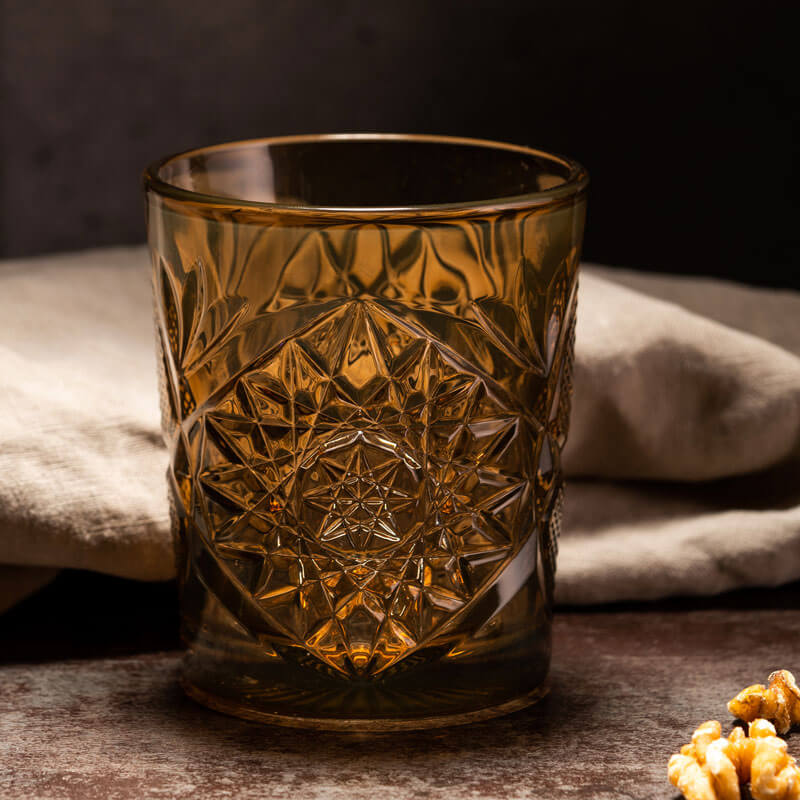 The ICON D.O.F. tumbler is available here in the color ochre. This color is a mixture of a dark yellow with reddish-brown accents. As a result, the tumbler is intensely colored with little transparency. The ICON pattern is particularly clear in its visibility: a variety of shapes interrupted by deep grooves. With its large volume, the D.O.F. glass is not only suitable for the eponymous Double Old Fashioned (D.O.F.), but also for water, soft drinks as well as various cocktails. The ochre-colored tumbler is also a beautiful tea light holder, as it creates a calm atmosphere with its dark appearance.