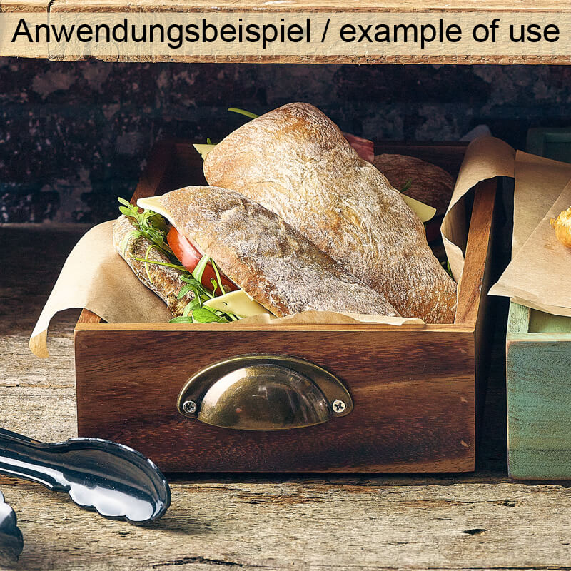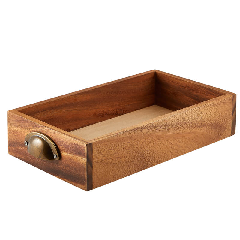 -Made of acacia wood -Natural acacia wood finish -Size GN1/3 -With attractive brass handles