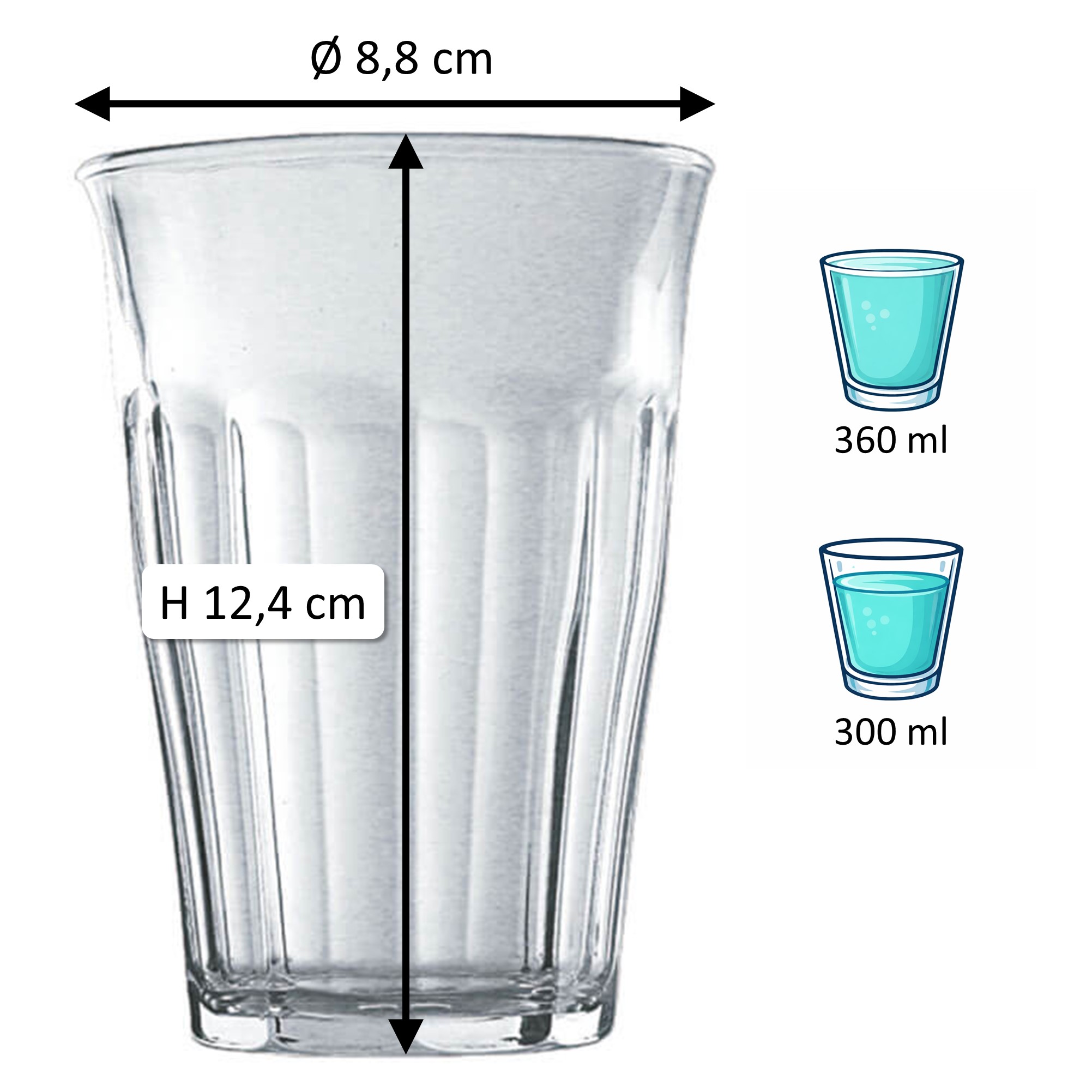1Note: The specified 'total volume' (also referred to as gross capacity) of a glass indicates the maximum amount of liquid it can hold when filled to the brim. In contrast, the 'fill volume' (also referred to as usable volume or serving volume) describes the practically usable amount. Both values are given in ml or l. Due to production conditions, a tolerance of ±5% may occur, which corresponds to industry standards and does not constitute a defect.
