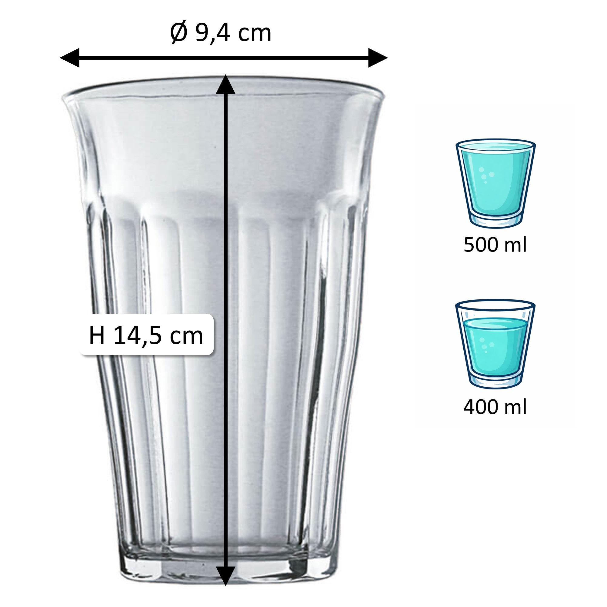 1Note: The specified 'total volume' (also referred to as gross capacity) of a glass indicates the maximum amount of liquid it can hold when filled to the brim. In contrast, the 'fill volume' (also referred to as usable volume or serving volume) describes the practically usable amount. Both values are given in ml or l. Due to production conditions, a tolerance of ±5% may occur, which corresponds to industry standards and does not constitute a defect.