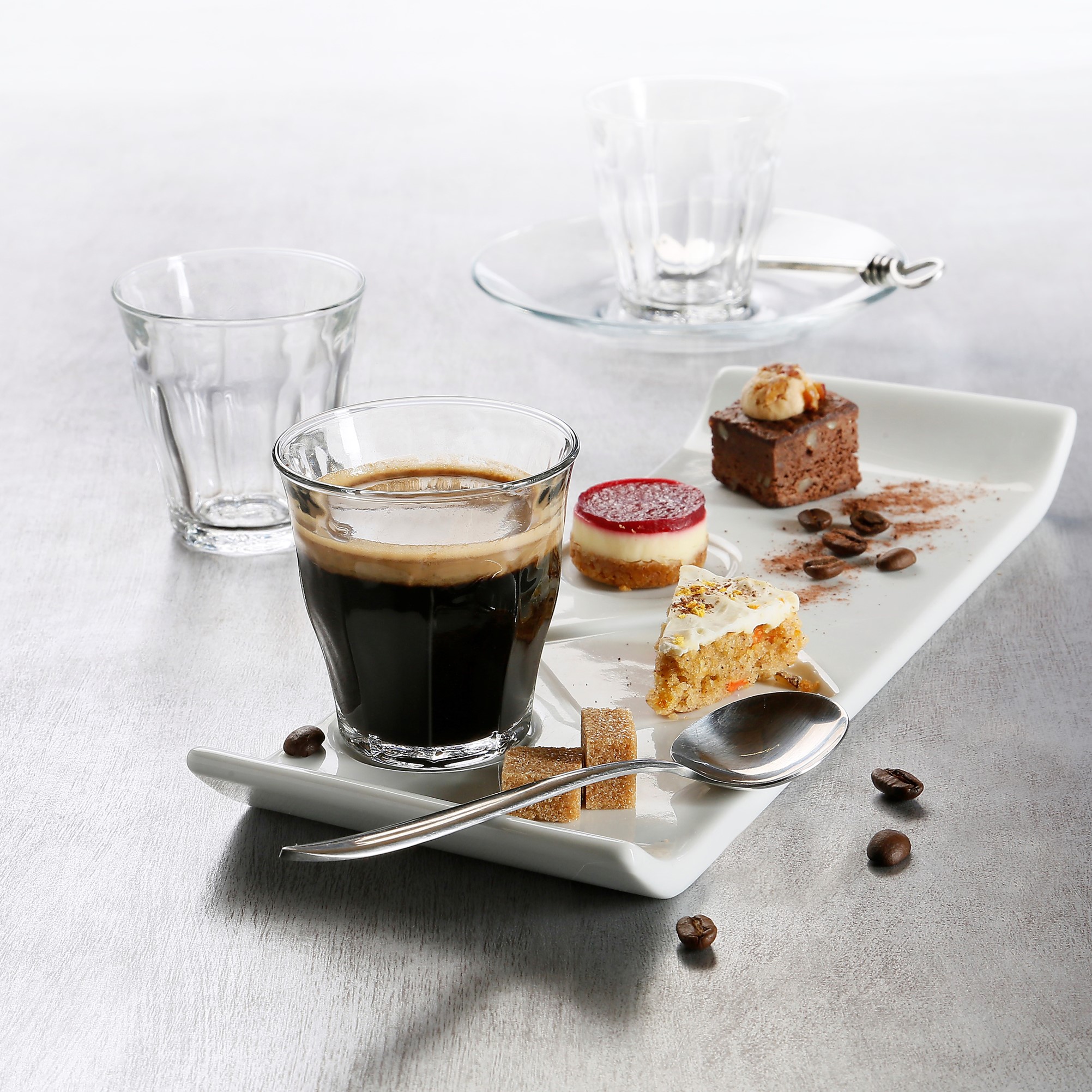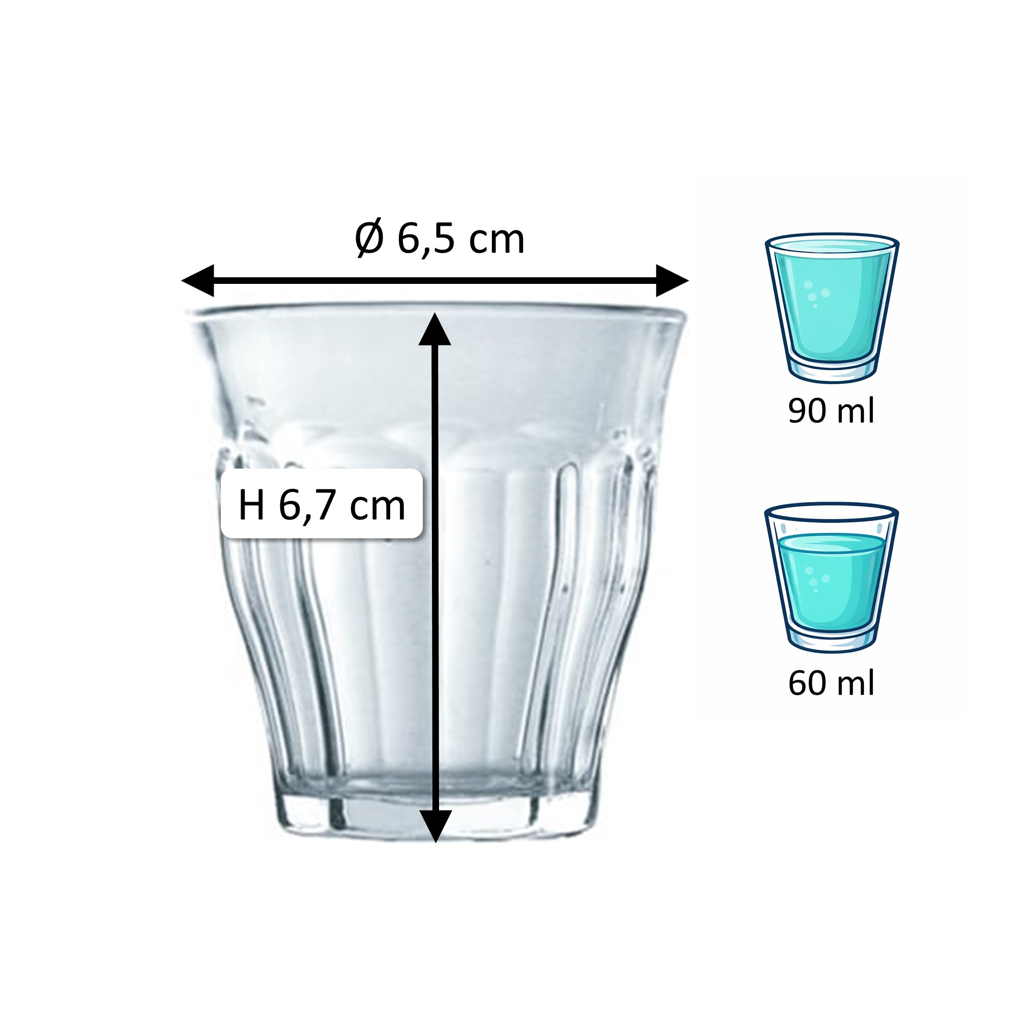 This small 'Picardie' cup by Duralex has a capacity of 90ml and a diameter of 6,5cm. The cup is suitable for serving water with a espresso or whiskey. It has a ground surface, which will make the cup handy and give a good grip.