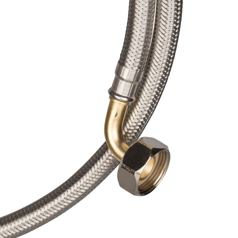 This stainless steel braid flex hose is 1,50m long. The two 3/4" connections differ in that one sits straight while the other has a 90-degree angle.