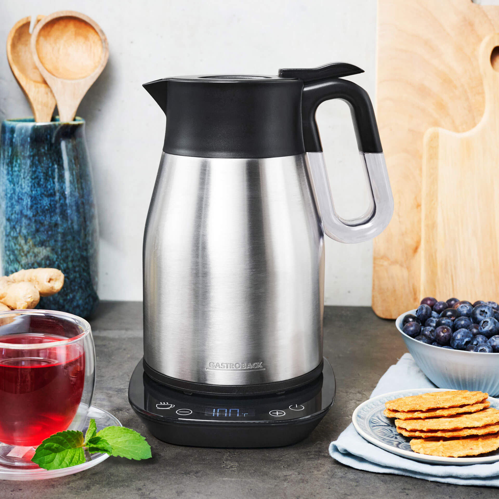 The Design Advanced Thermo kettle from Gastroback doubles as a thermos jug, giving you a practical 2-in-1 appliance. The base station has a digital LCD display and a sensor touch control panel. It can also be rotated 360° for extra flexibility when setting it up. The kettle jug holds up to 1,7 liters and the water can be heated in 13 stages to temperatures between 40 and 100°C. The temperature reached can be read on the display to the nearest degree.