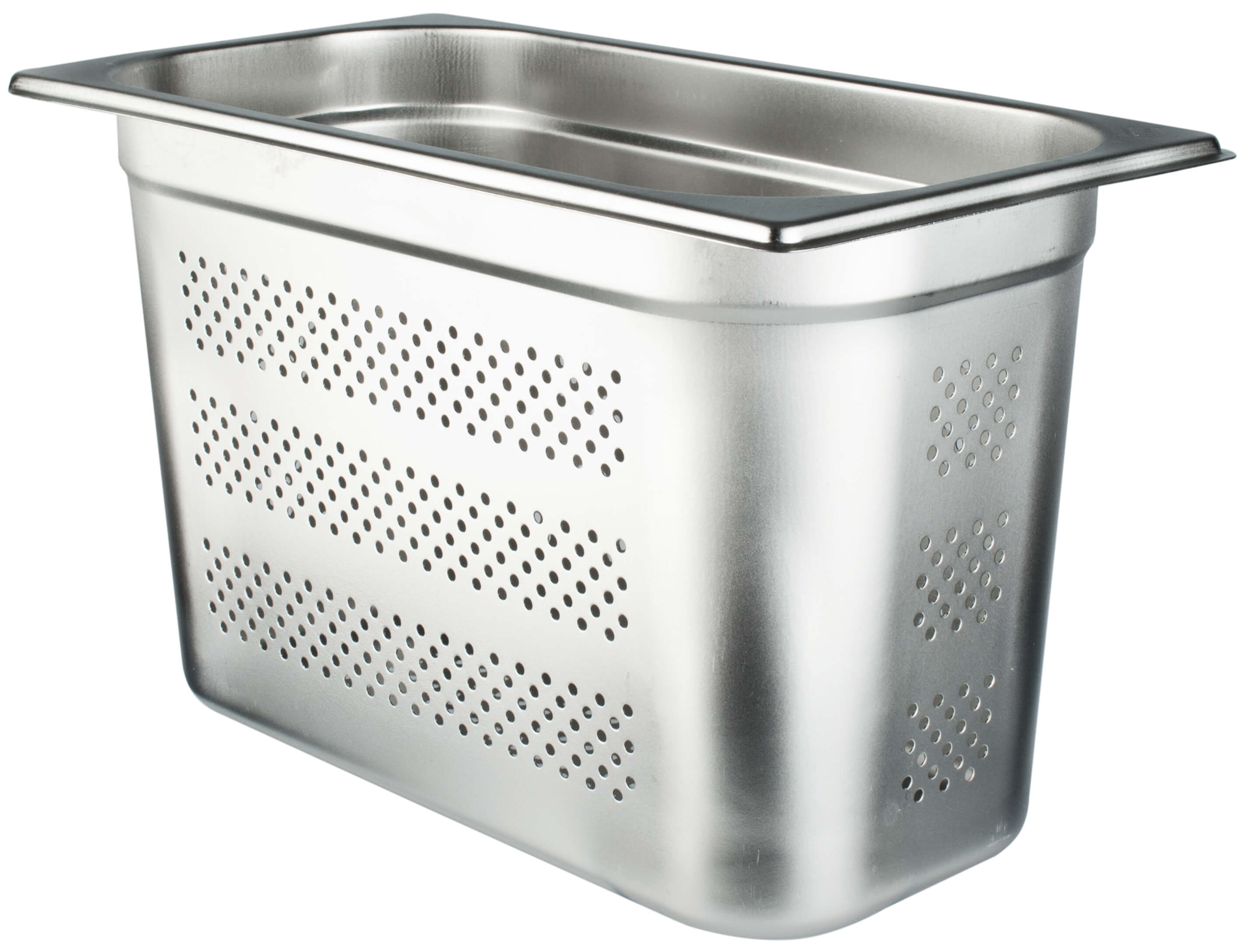 The walls and bottom of this GN-container are perforated. Therefore, it is particularly suitable for storing and serving ice cubes, fruits and vegetables, as their melting and washing water, as well as fruit juice can drain through the regular holes. The cuboid GN1/3 container is hence mainly used in refrigerated counters, at buffets, for transport, washing and (frozen) food storage. However, the stainless steel container is also heat-resistant and can be used to steam food.