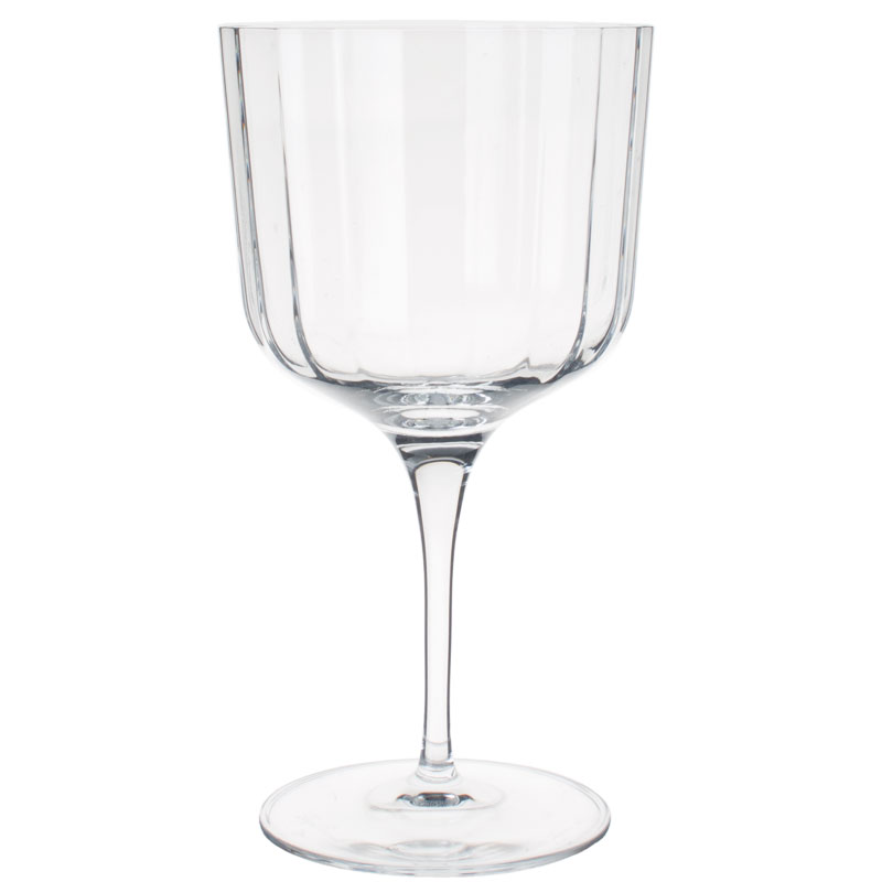 This large gin and tonic glass from Luigi Bormioli has plenty of room for ice, fruit, and herbs - both in the glass and as a garnish. The design of the Bach bar glass series is characterized by a blend of classic elegance and modern flair. Its pattern of vertical lines and faceted surfaces extends across the entire bowl of the gin and tonic glass. The stem and base, on the other hand, are smooth and unadorned so that the stemmed glass does not appear overloaded. The crystal glass used is dishwasher-safe, brilliant, and durable. This means that the gin and tonic glasses can also be used in the catering industry without any problems.