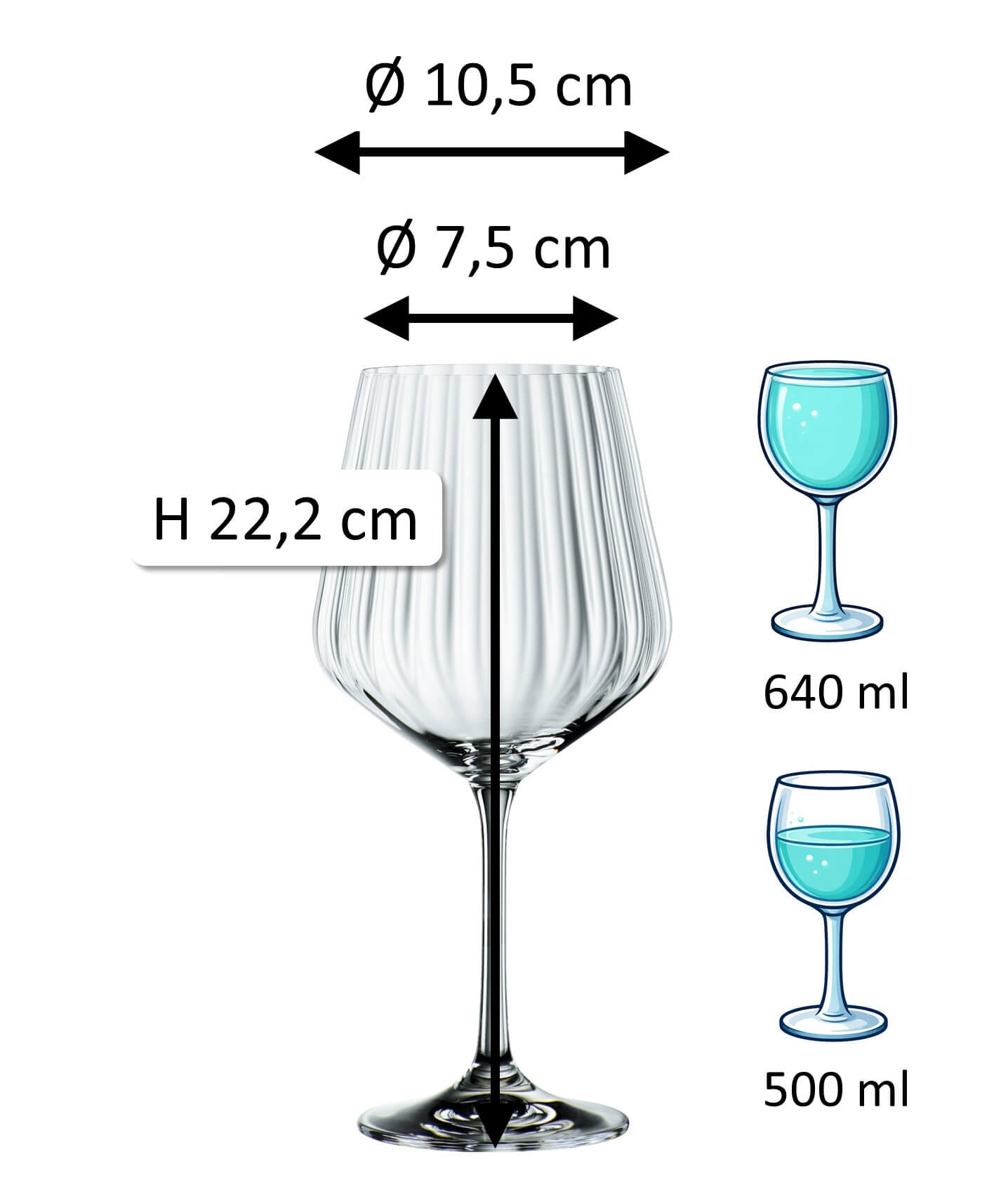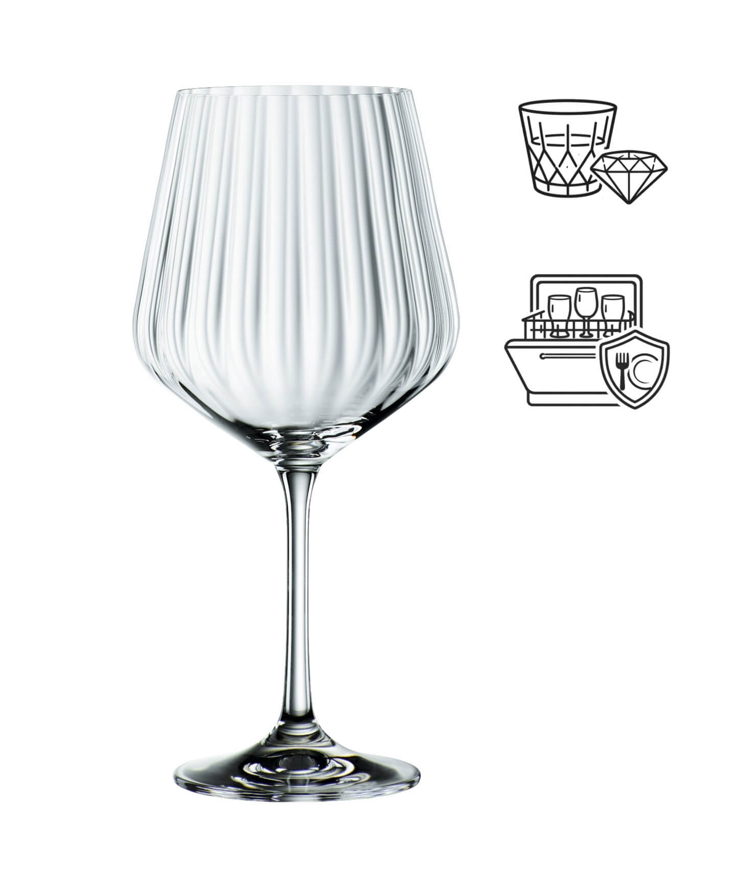 The Gin&Tonic glass by Nachtmann impresses with its high-quality execution, as well as the large-scale, attractive optical design. The high quality of the processed crystal glass is reflected in the pleasant and well-balanced heaviness. As a result, the gin and tonic goblet lies comfortably in the hand - held between the fingers or in the palm of the hand. The glasses' finish appears on the entire goblet and is made up of vertical grooves that have already been worked into the glass during the blowing process. This look creates a haptically and visually appealing three-dimensionality that gives the glass its extravagant and glamorous charm.