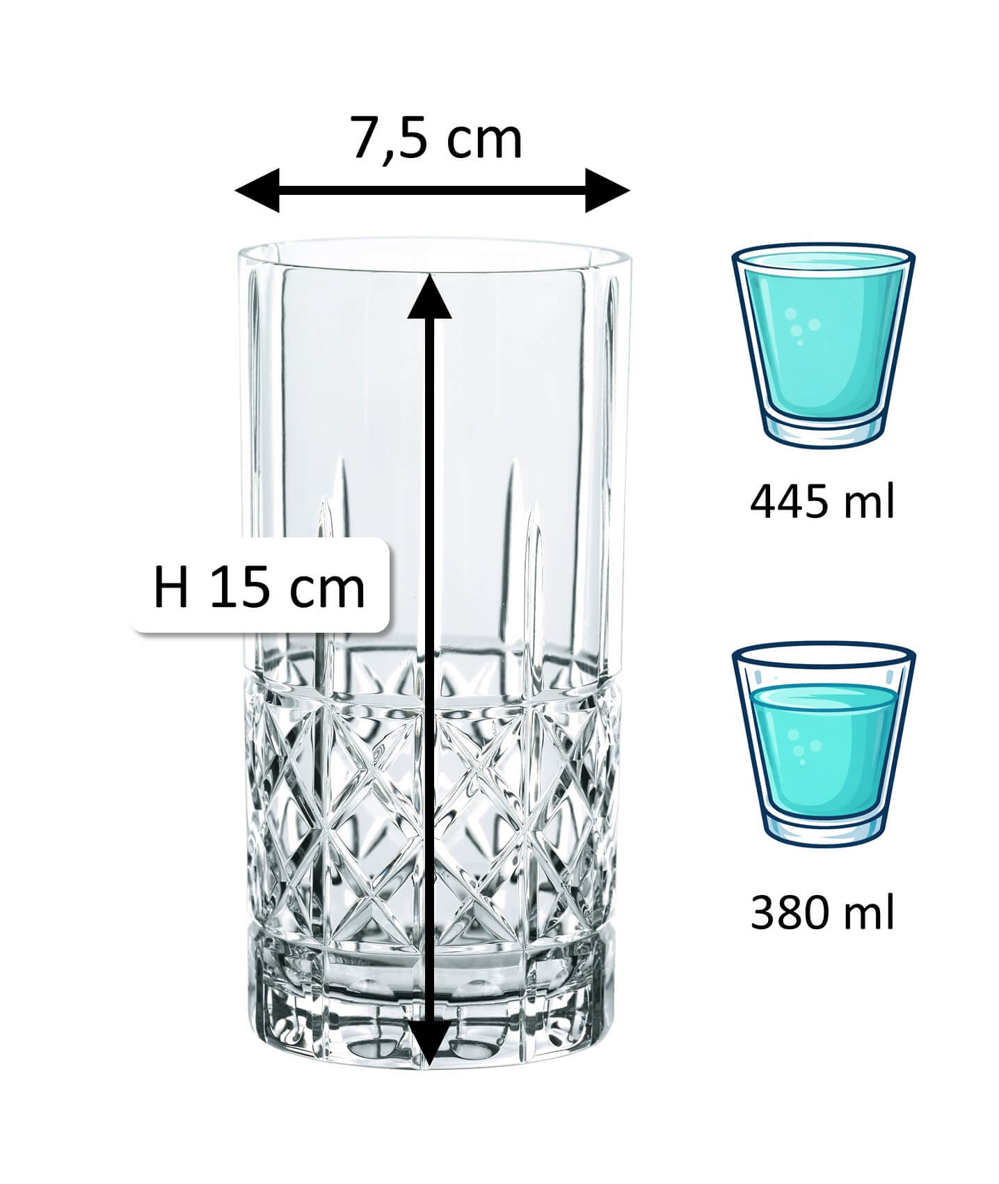 1Note: The specified 'total volume' (also referred to as gross capacity) of a glass indicates the maximum amount of liquid it can hold when filled to the brim. In contrast, the 'fill volume' (also referred to as usable volume or serving volume) describes the practically usable amount. Both values are given in ml or l. Due to production conditions, a tolerance of ±5% may occur, which corresponds to industry standards and does not constitute a defect.