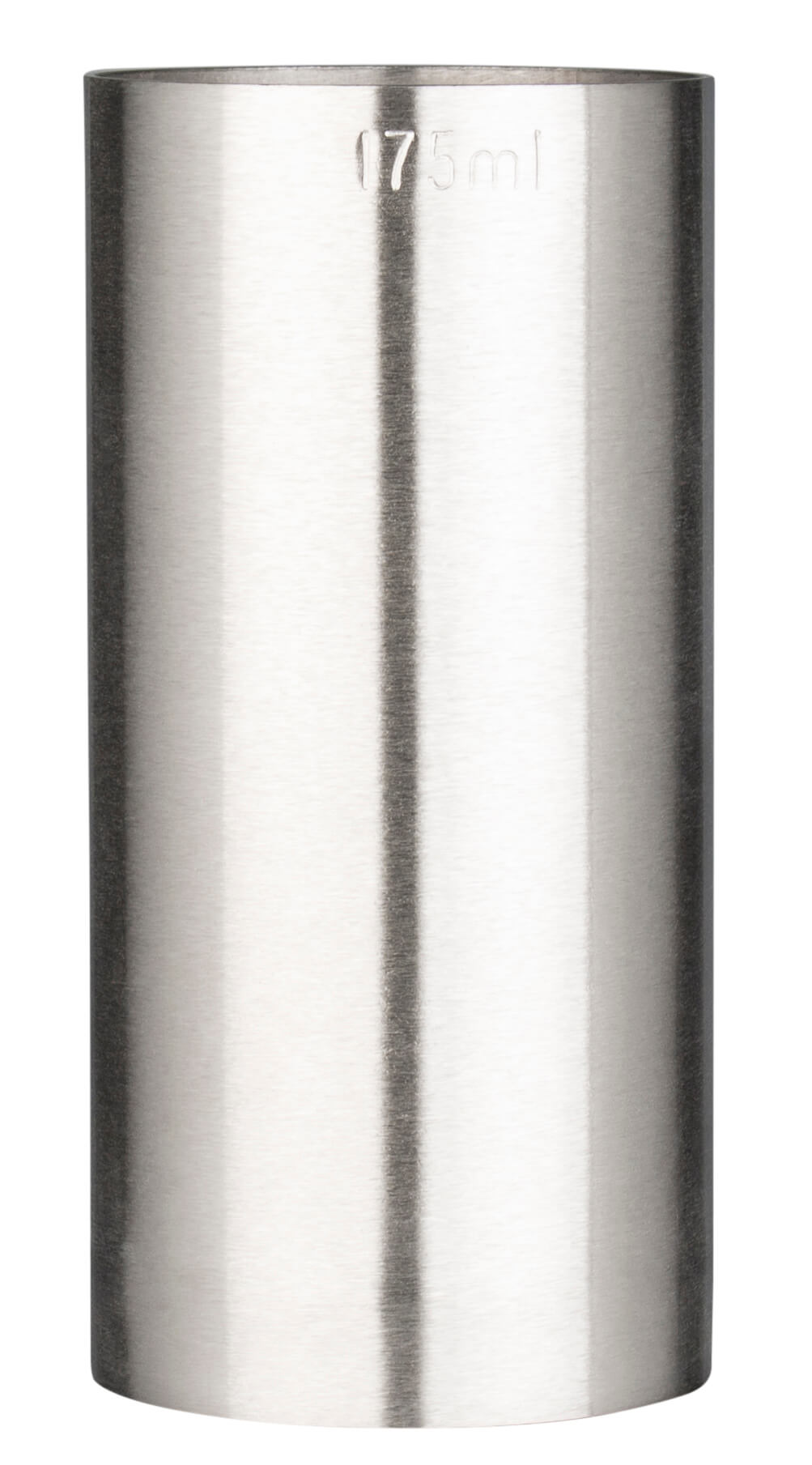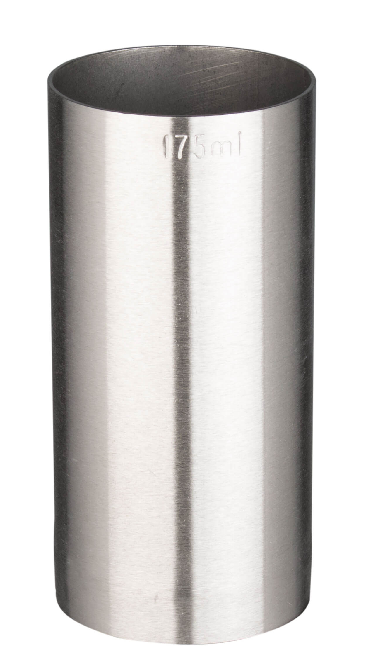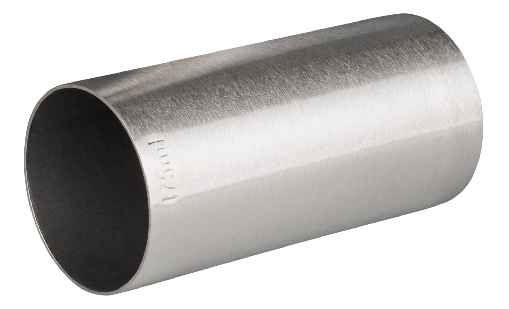 This 175ml stainless steel jigger is used for measuring liquids in the kitchen or behind the bar. The capacity 175ml is engraved just below the rim on the outside. Ingredients with this exact amount can be measured by filling the measuring cup to the brim. The bottom of the thimble measure is at a height of 1,0cm. It has a pleasant dead weight and stands securely on any surface.