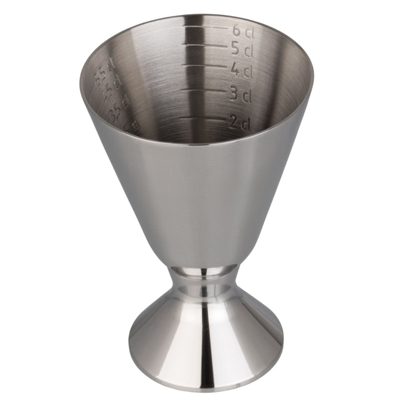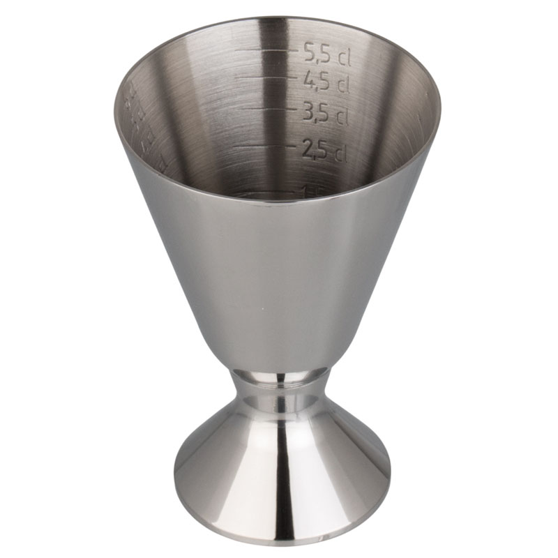 This jigger with 2 scales is made of polished stainless steel and holds up to 70ml. The bar jigger makes measuring correct quantities for cocktails and drinks much easier. The two scales are located inside the jigger and feature various steps in cl: