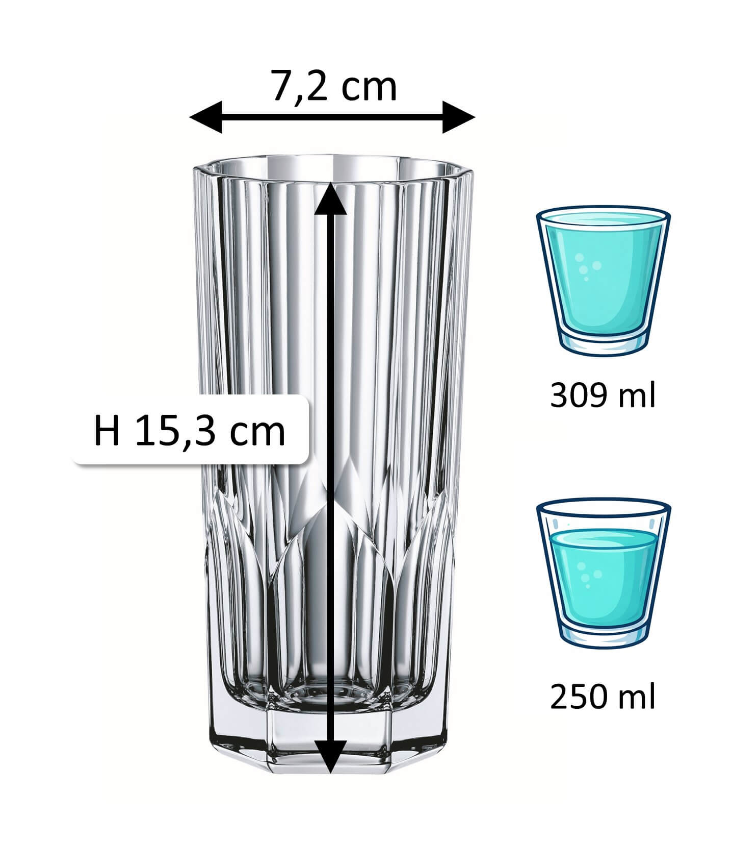 This longdrink glass made of crystal glass is part of the modern and eye-catching Aspen series made by Nachtmann. It has a capacity of 309ml and a height of 15,3cm. Use this noble and timeless drinking cup to serve longdrinks and cocktails.