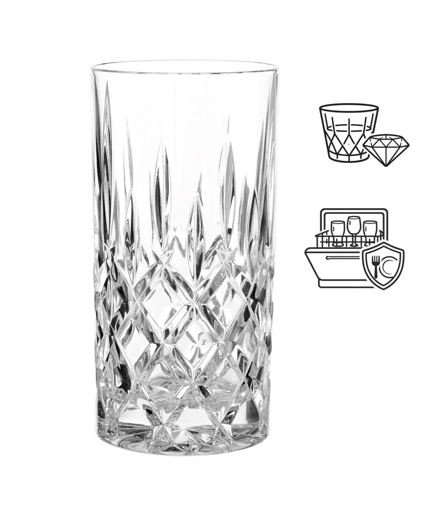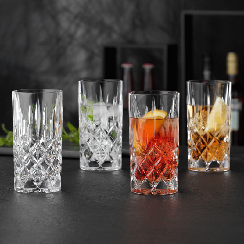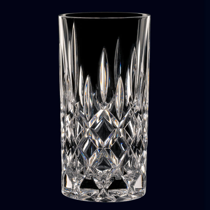 In addition to long drinks and cocktails, the ‘Noblesse’ long drink glass is also ideal for soft drinks in the bar or at home. The classic pattern of diamonds and ellipses matches many furnishing styles and reflects the light in an appealing way.