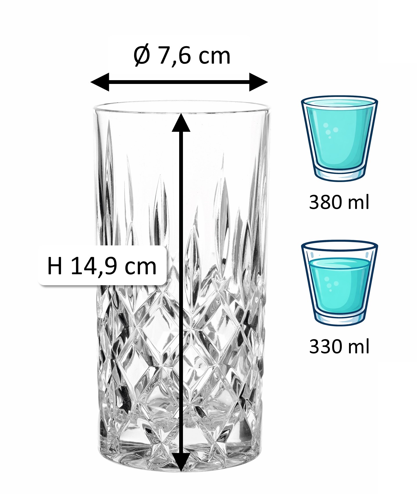 1Note: The specified 'total volume' (also referred to as gross capacity) of a glass indicates the maximum amount of liquid it can hold when filled to the brim. In contrast, the 'fill volume' (also referred to as usable volume or serving volume) describes the practically usable amount. Both values are given in ml or l. Due to production conditions, a tolerance of ±5% may occur, which corresponds to industry standards and does not constitute a defect.