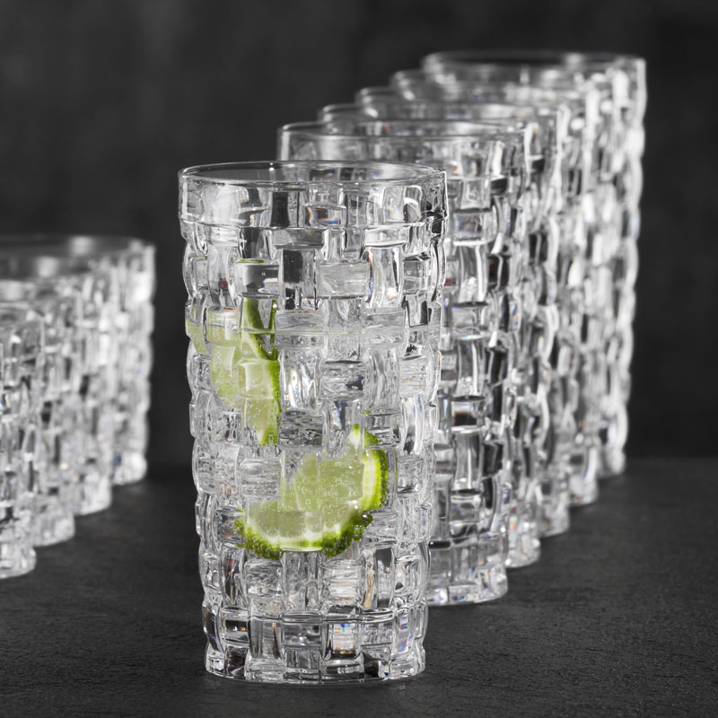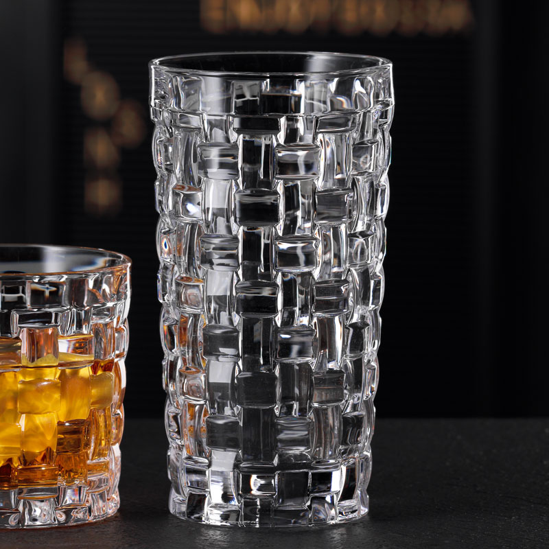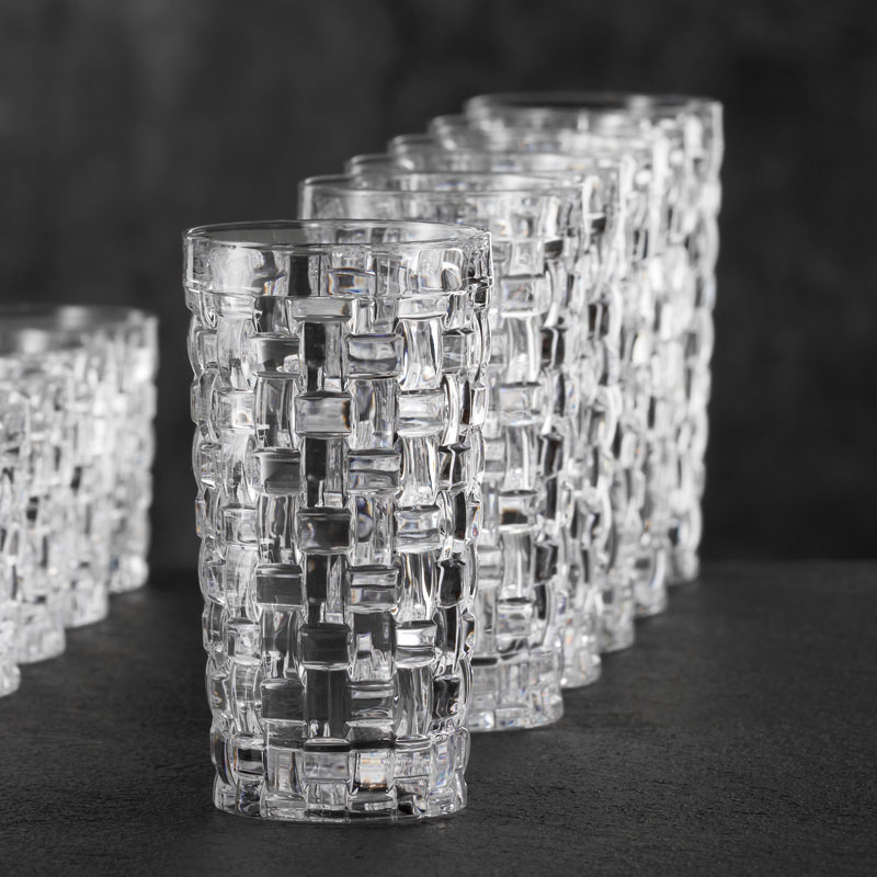 This long drink glass is an reflection to this attitude of life. It has the classical shape of a long drink glass combined with a modern structure and cut decoration reminiscent of a woven basket. You will get a crystal glass with unique light reflections.