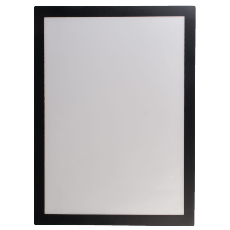 These information frames adhere to magnetic surfaces and are an easy way to present notices in an attractive way and change them quickly. The frame is black and magnetic. The film is robust and transparent. Simply open it up, insert an information sheet, the daily menu, or similar, and close it again. The two parts of the frame fit together neatly on their own. The magnetic frames are suitable for A4 sheets.