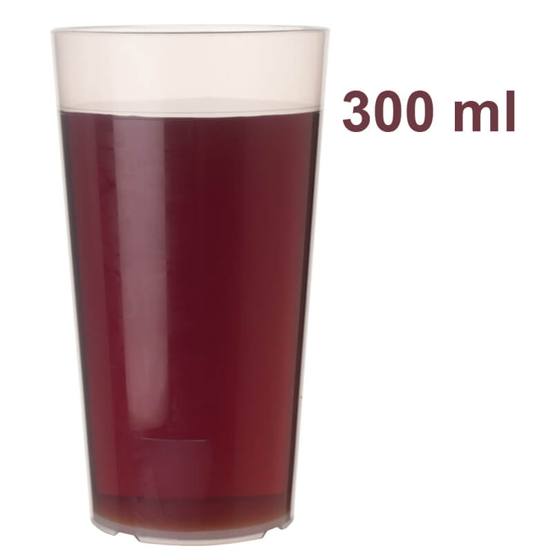 These reusable drinking cups from Papstar are made from robust polypropylene plastic and are therefore a more sustainable and tastier alternative to disposable tableware. The material is unbreakable, relatively scratch-resistant and, above all, suitable for the dishwasher. The cups are transparent with a slightly milky appearance, which means they can be used several times without any loss of appearance. They are designed for 300ml drinks and have a practical filling line at 0.3l.