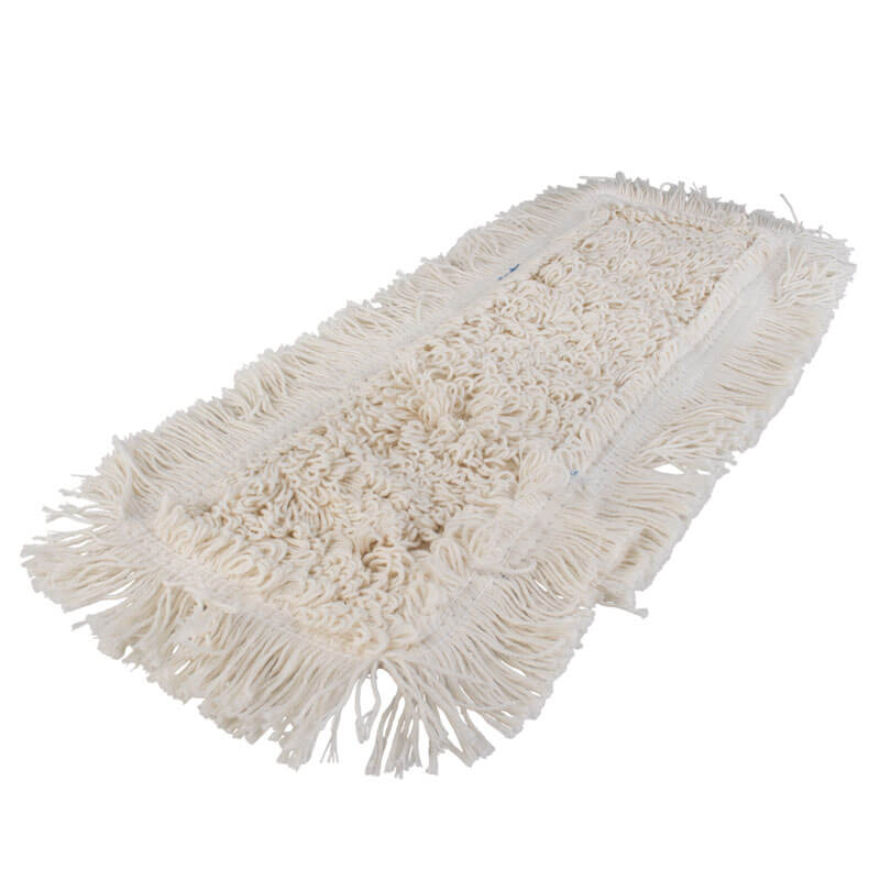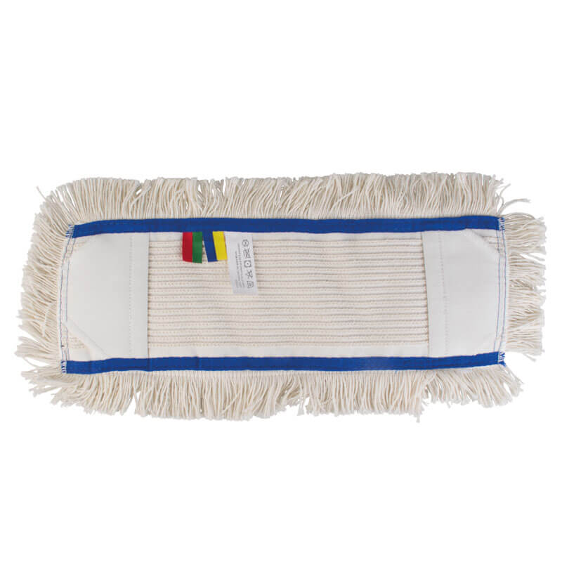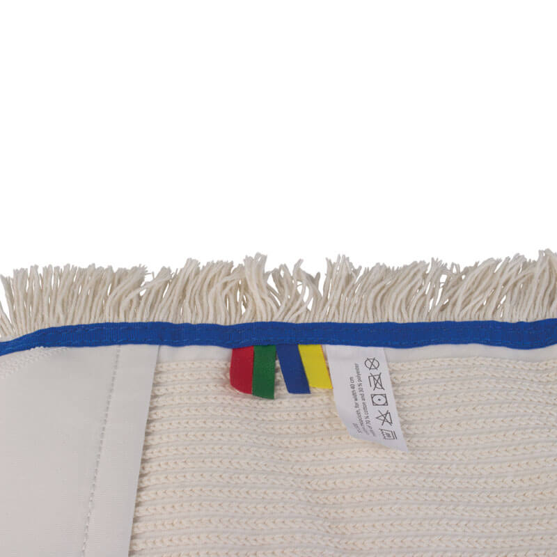This microfiber mop has cotton fringes for even better cleaning performance. The inner area with short fibers measures approx. 41x13 cm. Together with the long fringes, the mop measures approx. 50x23 cm. When choosing a mop holder, please make sure that it is suitable for 40 cm mops with pockets. On the back of the microfiber mop are flags in four different colors, which facilitate color coding for perfect hygiene in professional environments.