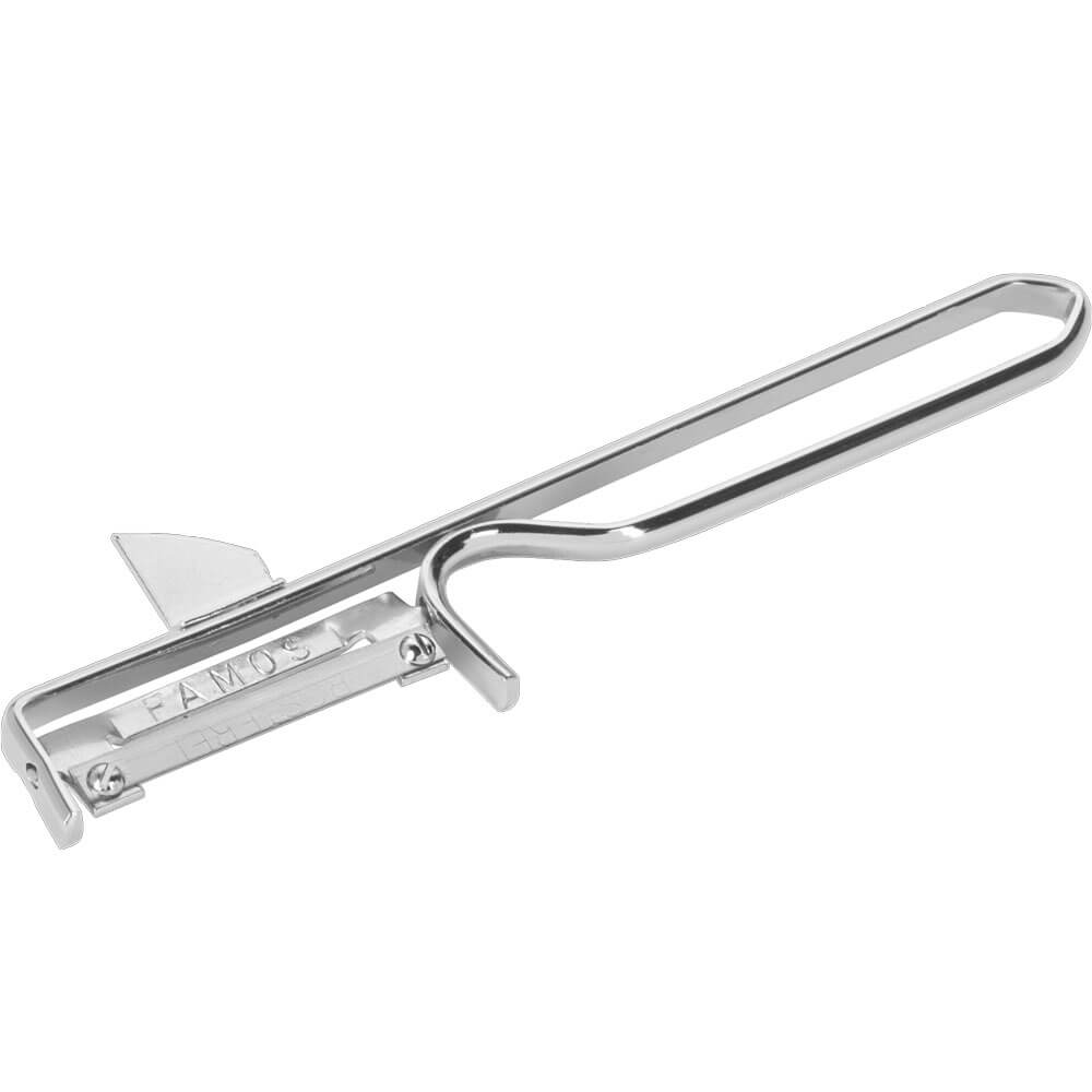 FAMOS created a splendid classic potato peeler. It is made of metal and is qaulified for right-hander. A sharp and stainless steel knife is fixed on a free moving pendulum. Therefore, especially uneven fruit and vegetables can easily be peeled. The flag shaped knife attatched to the rim can be used for cutting out parts of the peel. Furthermore, this potato peeler is smooth to your hand and the curved hilt in front of the blade acts as a protector.