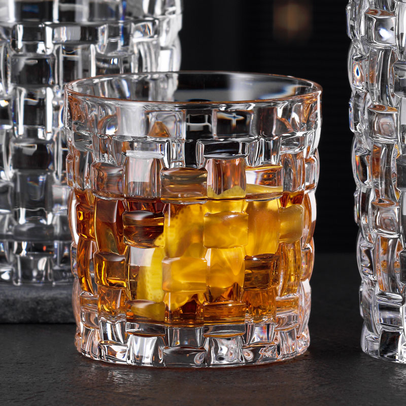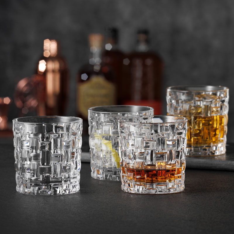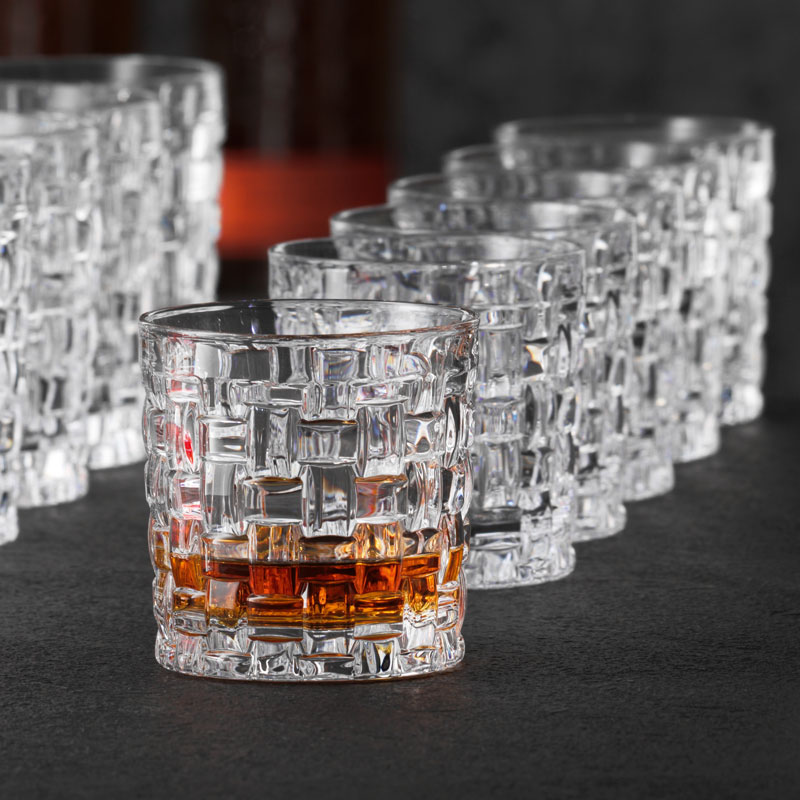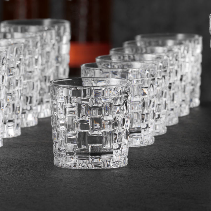 This S.O.F. tumbler is suitable for serving whisky and small cocktails, like a single Old Fashioned (S.O.F.). The small whisky glass is 8,4cm high, 8cm wide and holds 250ml. The sides are adorned with a cut basket pattern, which generates an impressive three-dimensionality. This ensures a secure grip and an atmospheric play of light. The tumbler comes from the 'Bossa Nova' series by Nachtmann, in which all products feature this unique cut pattern.