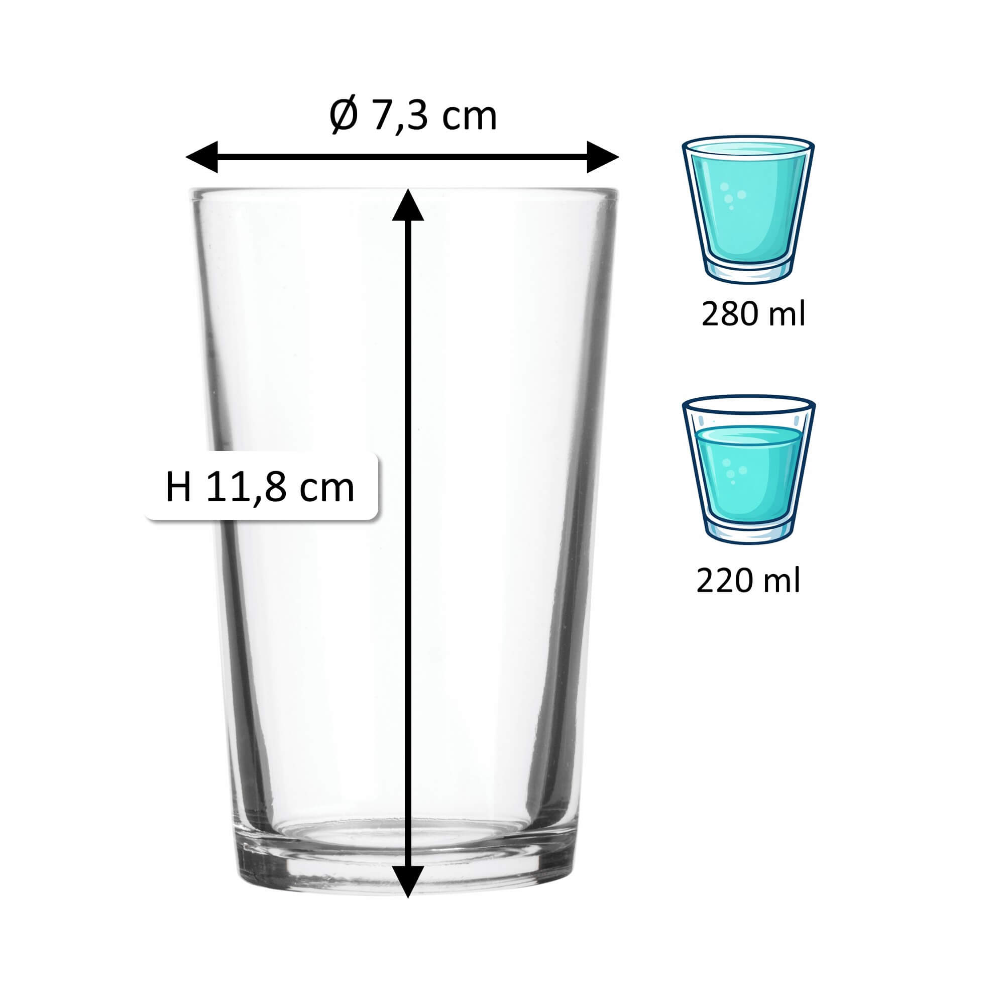 1Note: The specified 'total volume' (also referred to as gross capacity) of a glass indicates the maximum amount of liquid it can hold when filled to the brim. In contrast, the 'fill volume' (also referred to as usable volume or serving volume) describes the practically usable amount. Both values are given in ml or l. Due to production conditions, a tolerance of ±5% may occur, which corresponds to industry standards and does not constitute a defect.