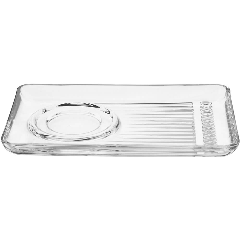 The rectangular glass saucer is decorated with the pattern from the 'Elysia' series by Pasabahce. It fits the handled mugs from the Elysia series in various sizes (order no. 9631, 9632, 9633).
