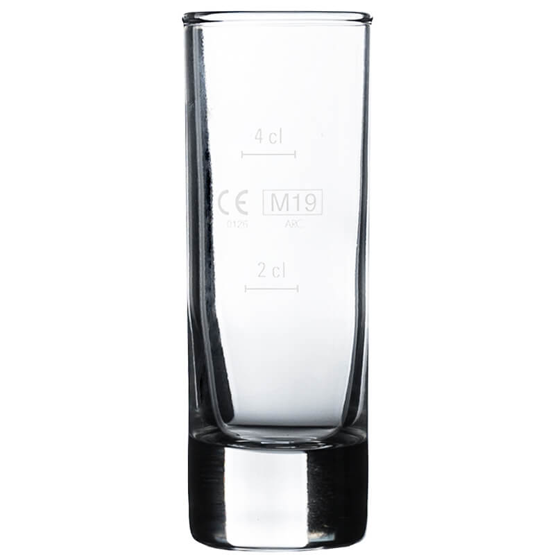 Cylindric shaped, tough base, perfectly rounded off rim and as well availablewith or without 2 and 4cl calibration mark. Therefore this stamper glass can beespecially used for clear, freezy spirits like vodka. The shot glass gets in anyfridge a space and therefore it can be smoothly chilled. Thus we recommend this glass to all bars, restaurants and associations which serves clear and high-proofalcohol.