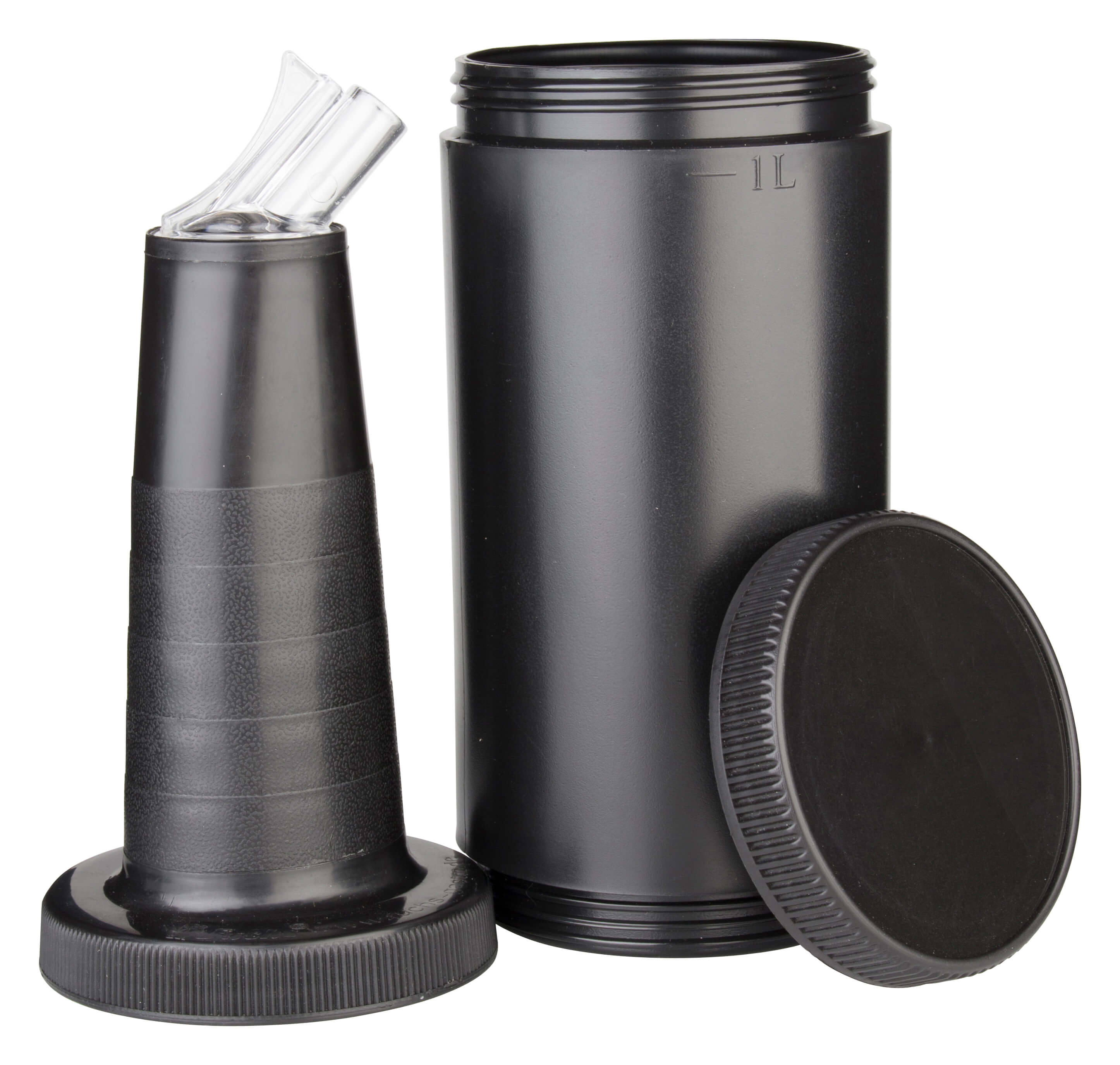 The black Bottle-Pour-Master by Fuchs will win you over with its dual function: measuring and storing. The plastic bottle has a capacity of 1,0l and the black surface looks good in every bar. With a hight of 36,0cm and a diameter of 9,0cm, this speedbottle is easy to handle, too.