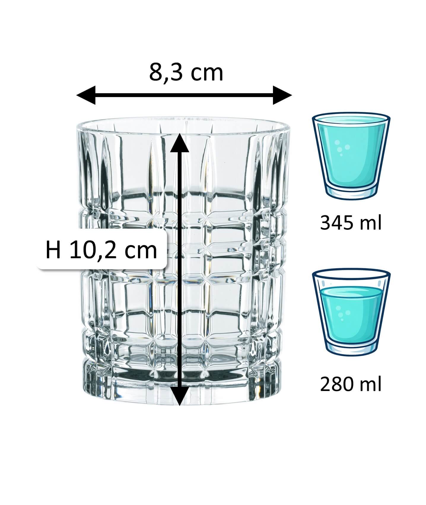 1Note: The specified 'total volume' (also referred to as gross capacity) of a glass indicates the maximum amount of liquid it can hold when filled to the brim. In contrast, the 'fill volume' (also referred to as usable volume or serving volume) describes the practically usable amount. Both values are given in ml or l. Due to production conditions, a tolerance of ±5% may occur, which corresponds to industry standards and does not constitute a defect.