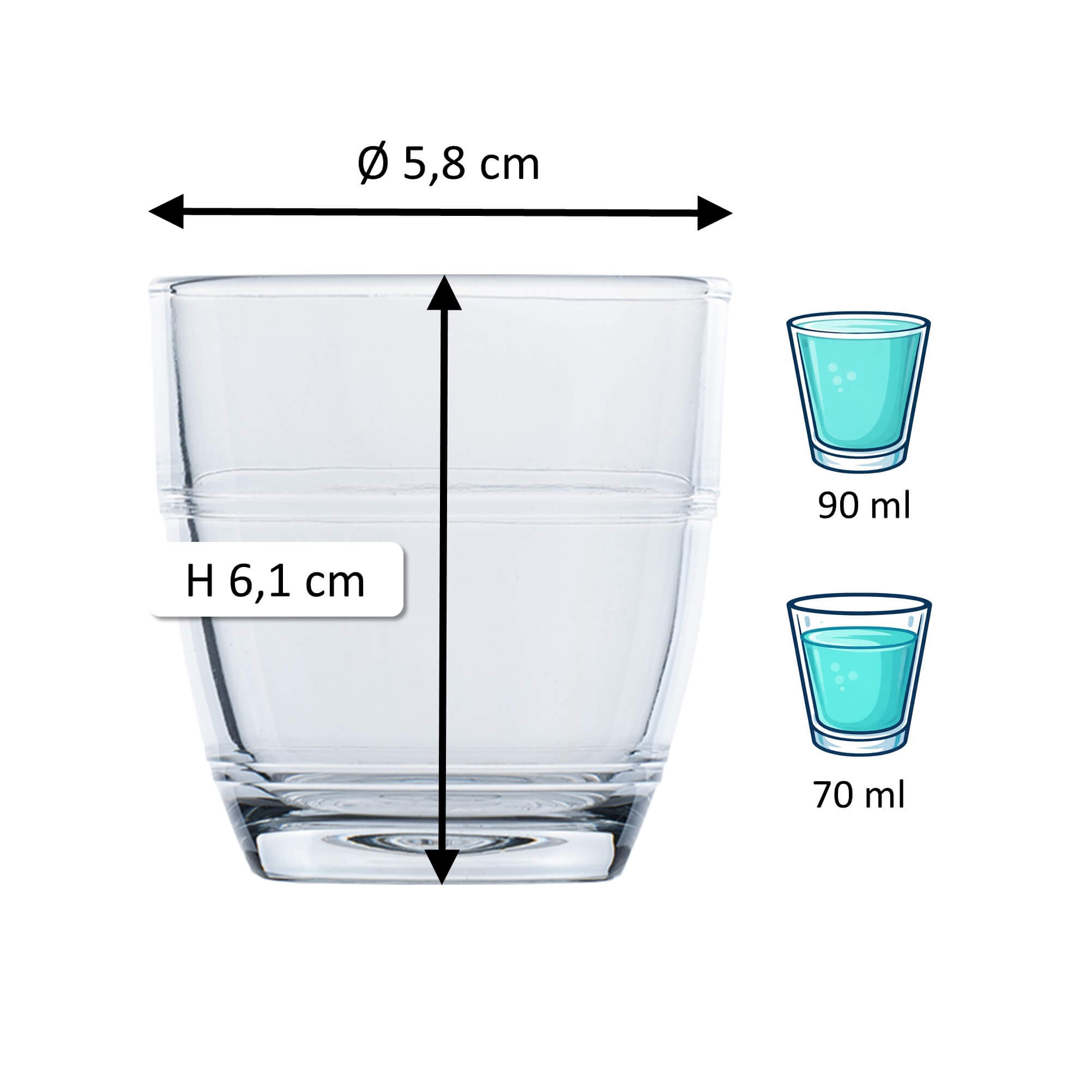 1Note: The specified 'total volume' (also referred to as gross capacity) of a glass indicates the maximum amount of liquid it can hold when filled to the brim. In contrast, the 'fill volume' (also referred to as usable volume or serving volume) describes the practically usable amount. Both values are given in ml or l. Due to production conditions, a tolerance of ±5% may occur, which corresponds to industry standards and does not constitute a defect.
