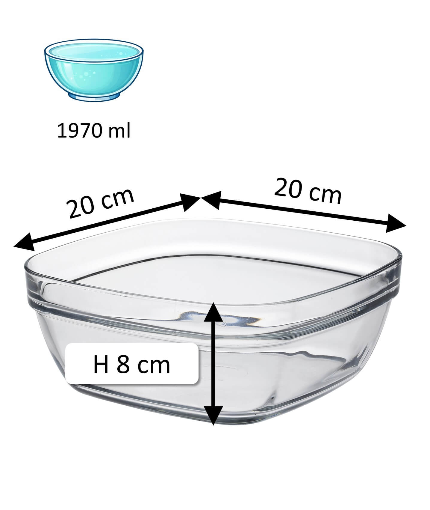 This glass bowl has a side length of 20cm at the rim and is 8cm high. This results in a volume of 1,97 liters. The tempered glass makes the bowl particularly robust and durable and it can be cleaned in the dishwasher. The glass bowl from Duralex is also suitable for the freezer. Like all bowls in the Lys Carré series from Duralex, it is stackable and can be stored or placed at the buffet in a space-saving manner. Last but not least, the stackable bowl can be used as a storage container if you purchase the matching polyethylene lid (order no. 11388-1).