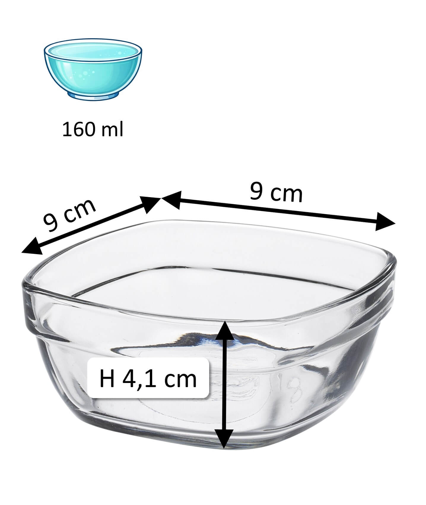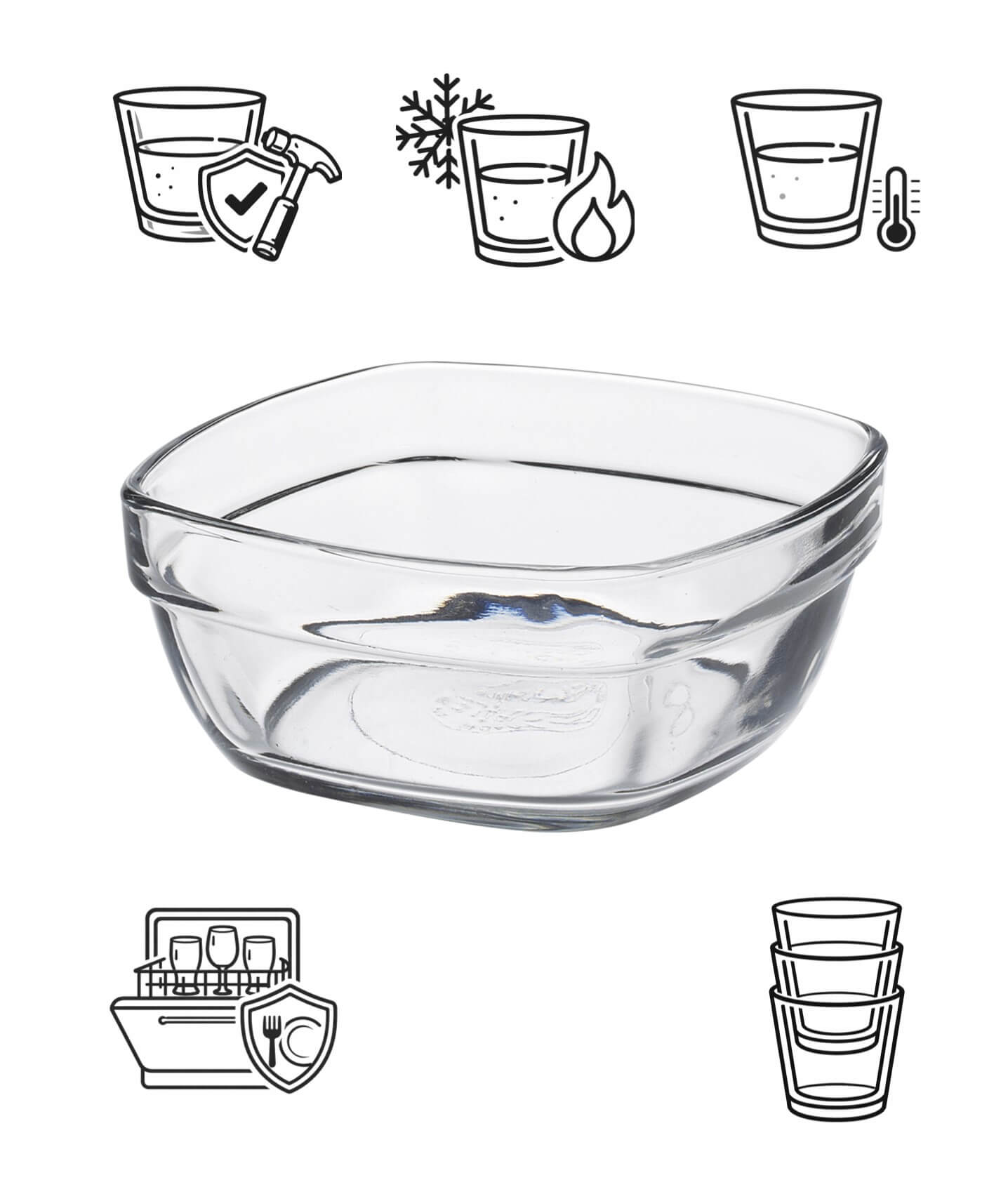 This square glass bowl is made of tempered glass and is 9x9cm wide. The glass from Duralex is dishwasher-safe and robust. The bowls from the Lys Carré range can also be stored stacked. This makes them particularly popular for communal catering and buffets.