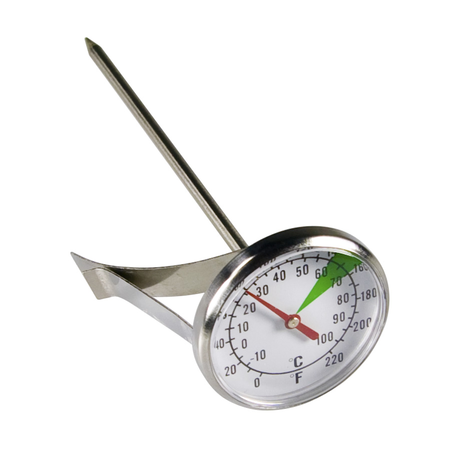 The measuring pole is tiny and is equipped with a clip. The retaining clip issteplessly adjustable and provides you the possibility to fix it on the milkpourer´s rim without touching the pourer´s wall. This thermometer is excellenlyqualified for frothing milk up and should not be missing in a professionalCafé.