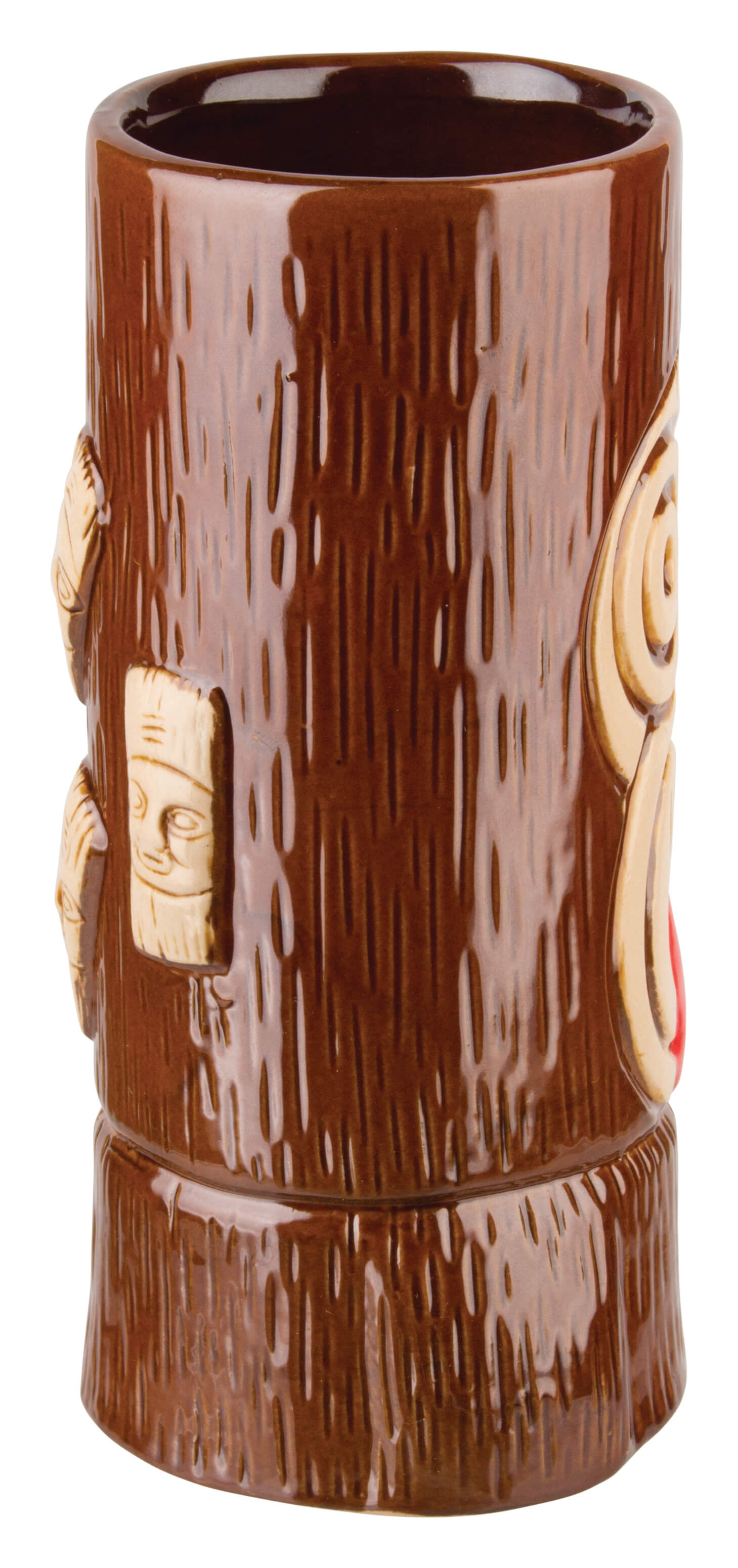 The eye-catcher in this Tiki mug is a face with big, round eyes and a bright red tongue. The face is abstract and it is up to the viewer to decide whether they consider it human, deity or animal. Around the face, the ceramic mug is painted a shiny brown and dotted with incised lines. Depending on the interpretation, this is the fur of a monkey or the bark of a tree trunk.