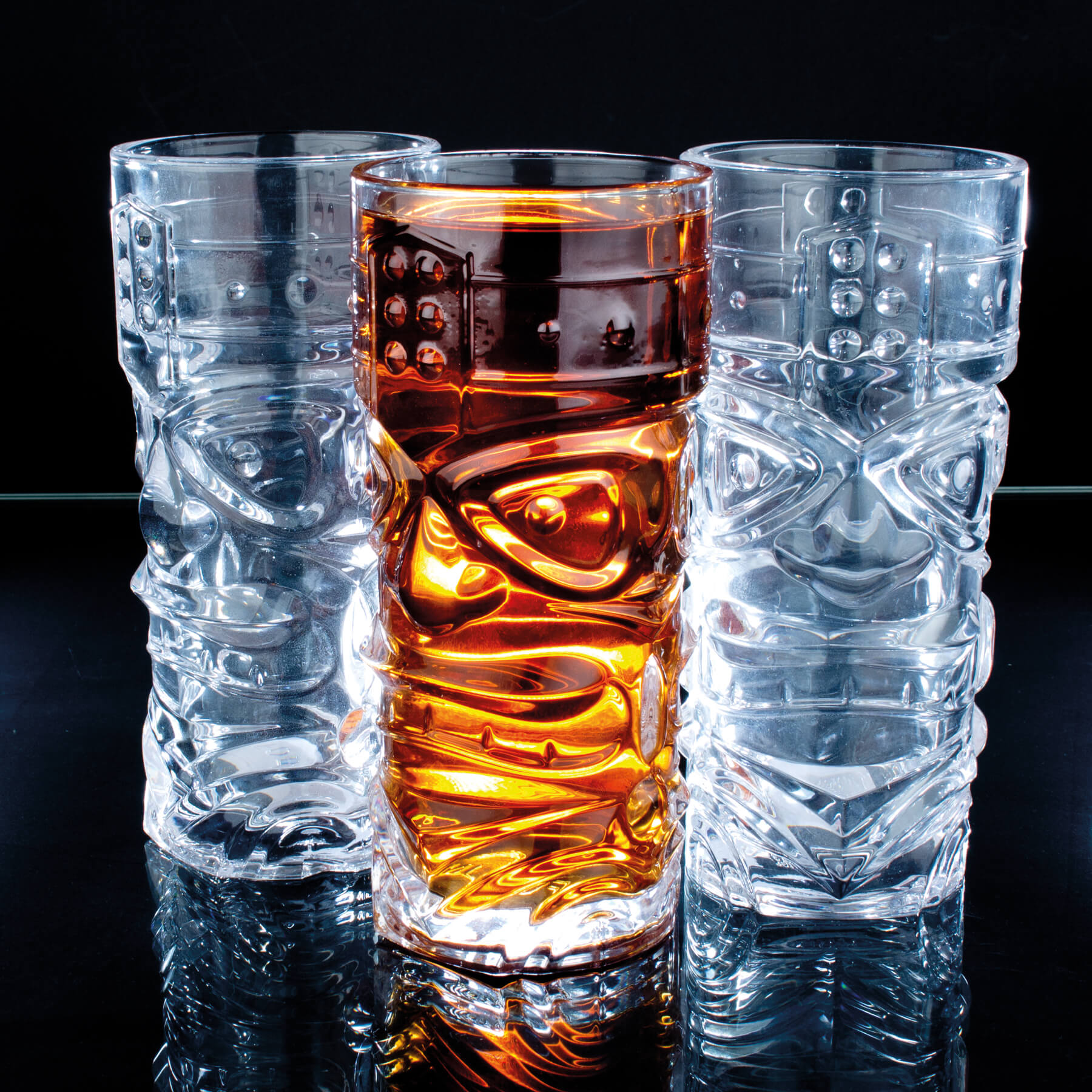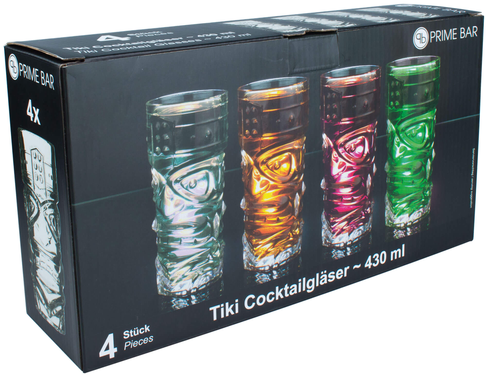 These Prime Bar Tiki Hi-Ball mugs feature a face on the front and back. By filling intensely colorful drinks, the contours of the Tiki gods become visible. The cylindrical glass is 16.6 cm high and has a volume of 430 ml with a diameter of approx. 7.6 cm.