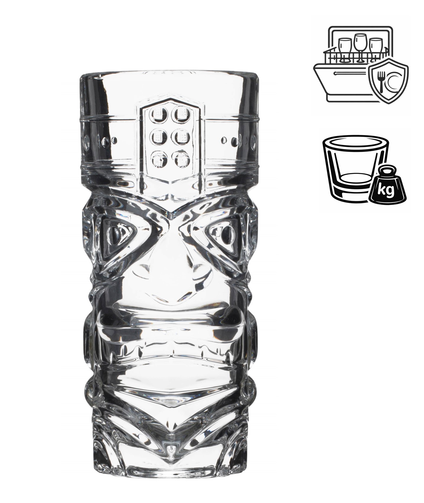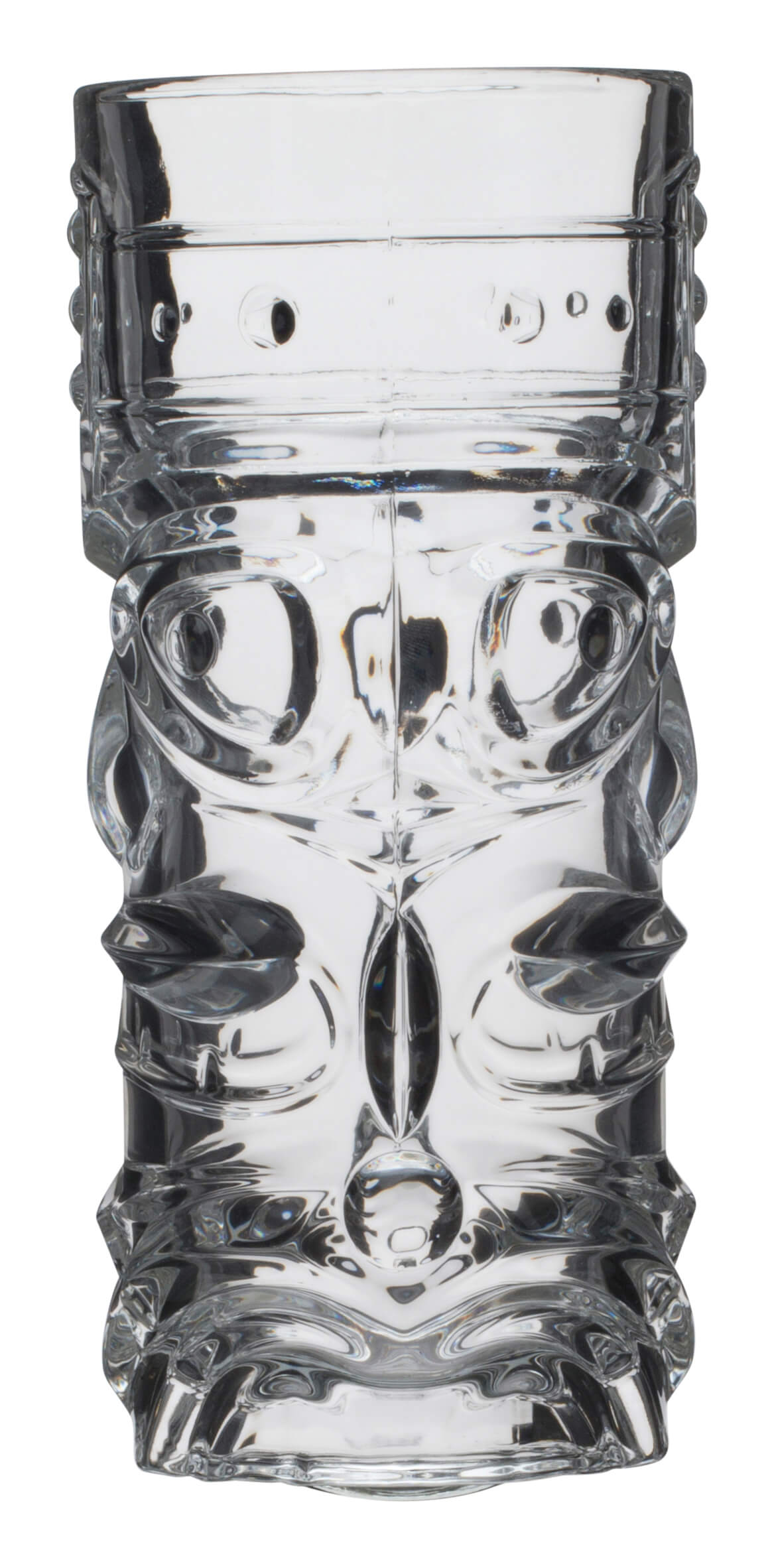 With this Hi-Ball Tiki, Prime Bar has created a glass image of a crowned, wild Tiki god. A face can be seen on the front and back.